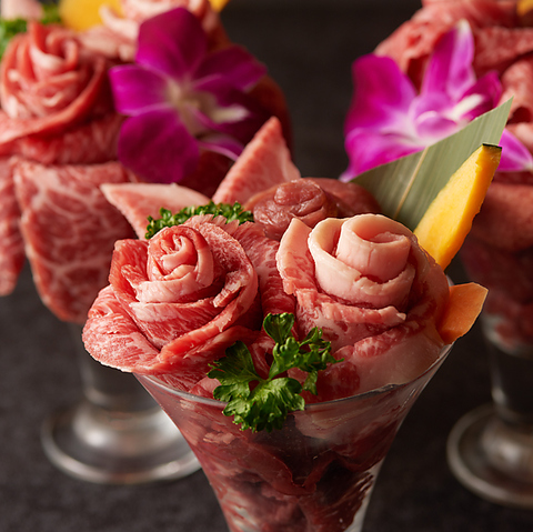 黒毛和牛上カルビや上赤身、名物の黒毛和牛ロング中落カルビなど和牛焼肉をとってもリーズナブルに楽しめる当店の一押し看板コースです。さらに花びらのように盛り付けた和牛肉パフェは事前予約で無料サービスしております。ご希望のメッセージを添えて大切な記念日を彩ります。席時間100分制LO80分ーーーーーーーー【飲み放題料金】※必ずつけていただいており、詳細は当日ご案内させていただきます。(通常価格)ソフトドリンク450円(税込490円)アルコール:1,500円(税込1,650円)(LINE友達価格)ソフトドリンク350円(税込380円)アルコール:750円(税込820円)