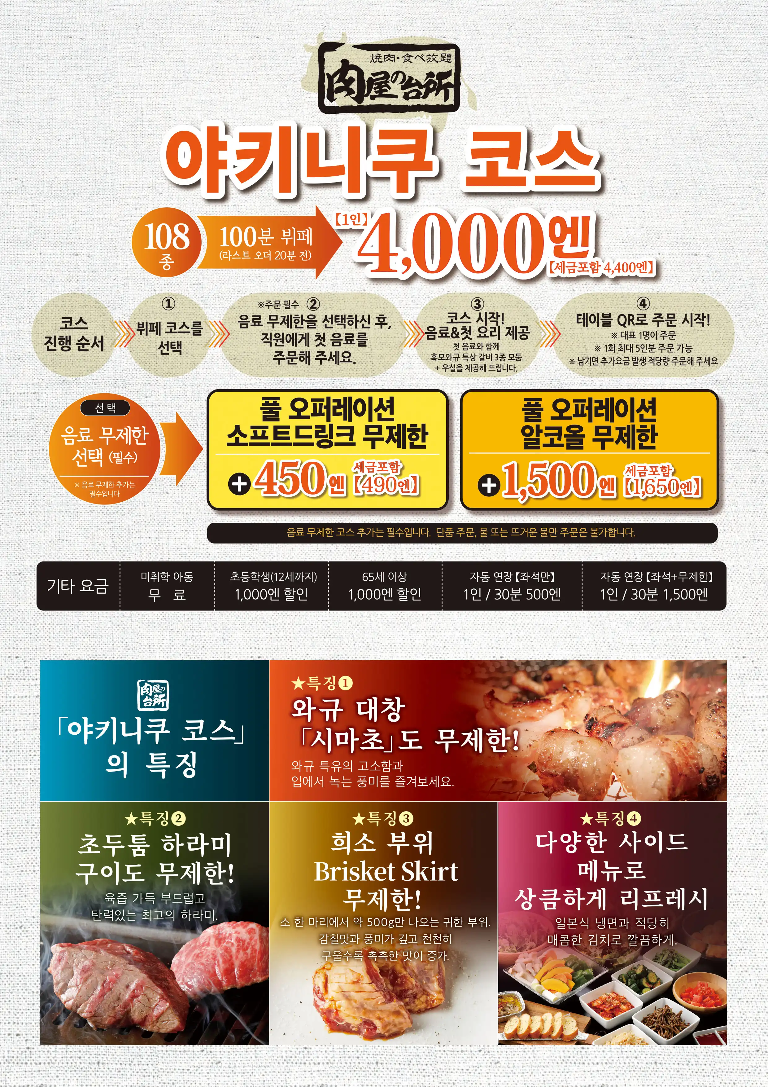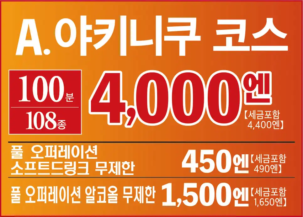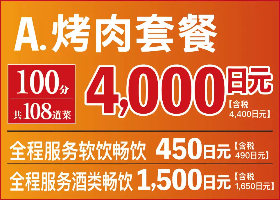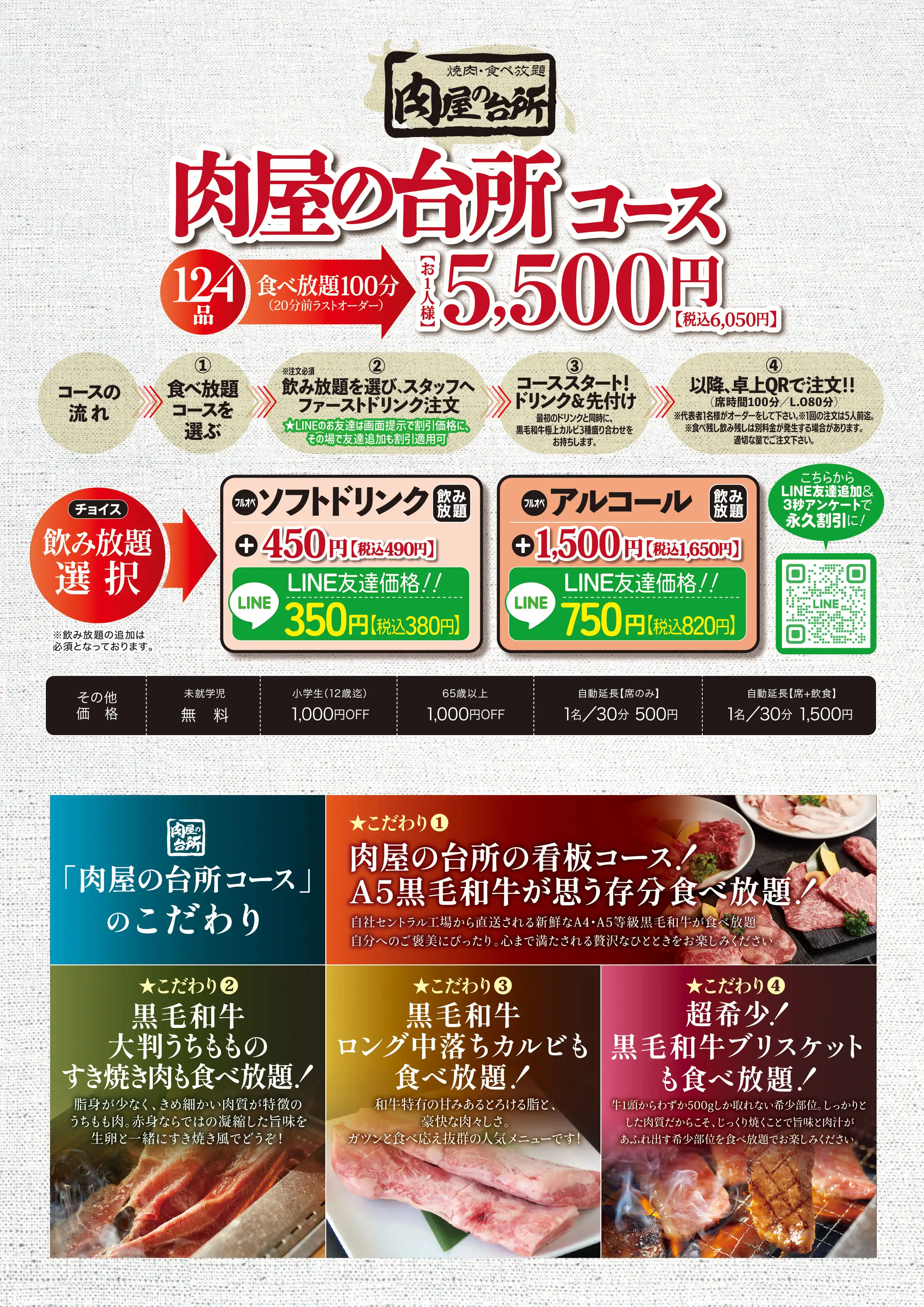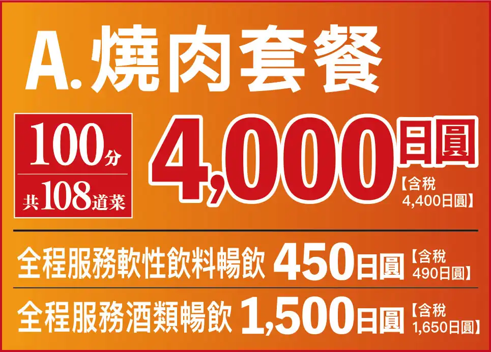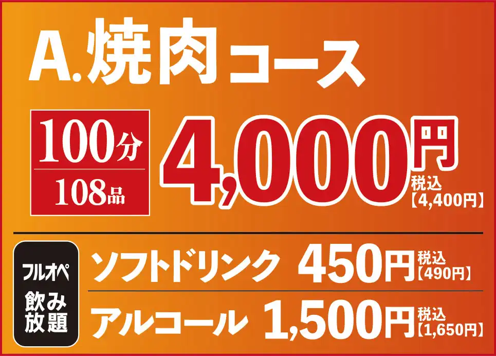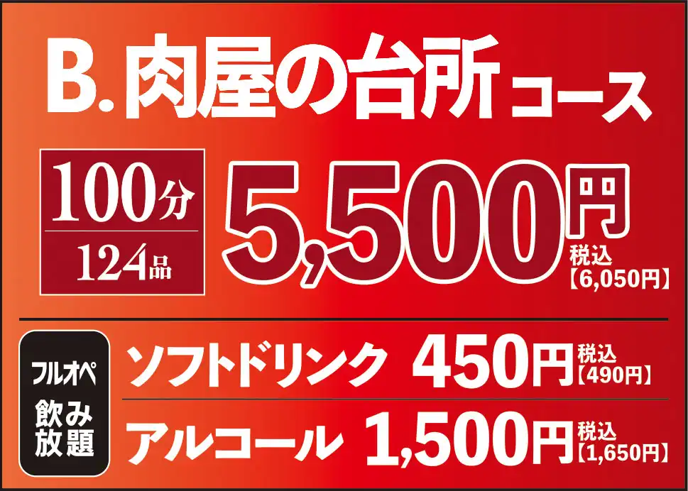 臭みが一切ない黒毛和牛の味噌ホルモンや塊肉の牛ハラミステーキ、この時期おすすめのすき焼き風焼肉などが食べ放題でお楽しみいただけます。ホイル焼きや締めのラーメンなどサイドメニューのバラエティも豊かなコースです席時間100分制LO80分ーーーーーーーー【飲み放題料金】※必ずつけていただいており、詳細は当日ご案内させていただきます。(通常価格)ソフトドリンク450円(税込490円)アルコール:1,500円(税込1,650円)(LINE友達価格)ソフトドリンク350円(税込380円)アルコール:750円(税込820円)