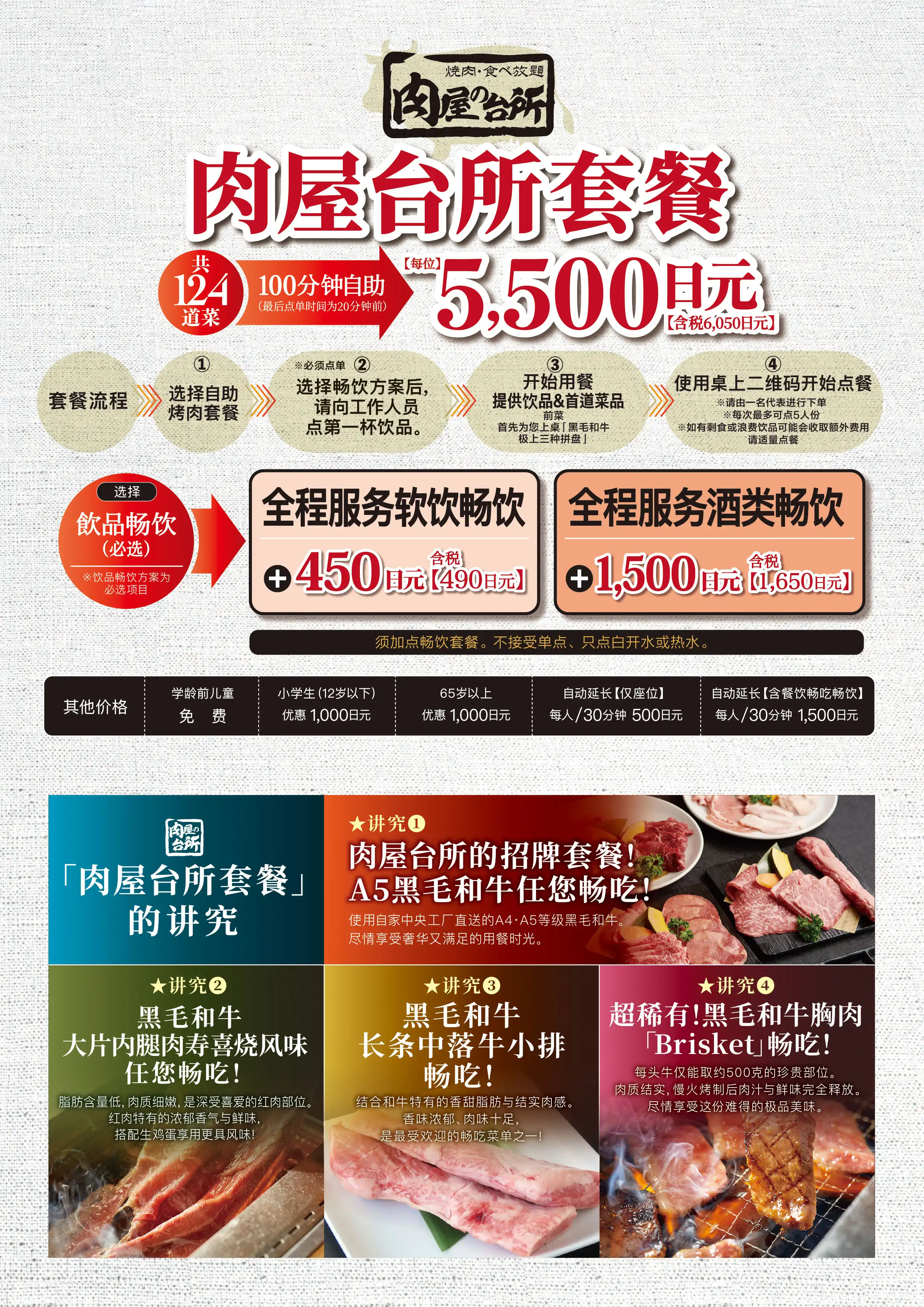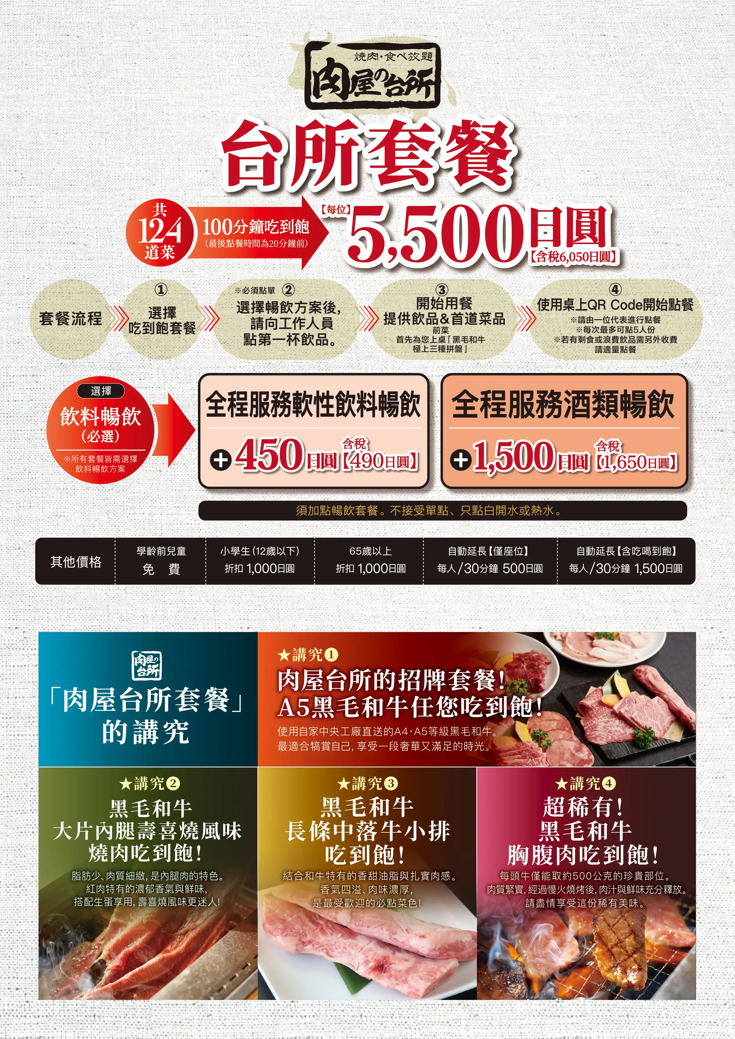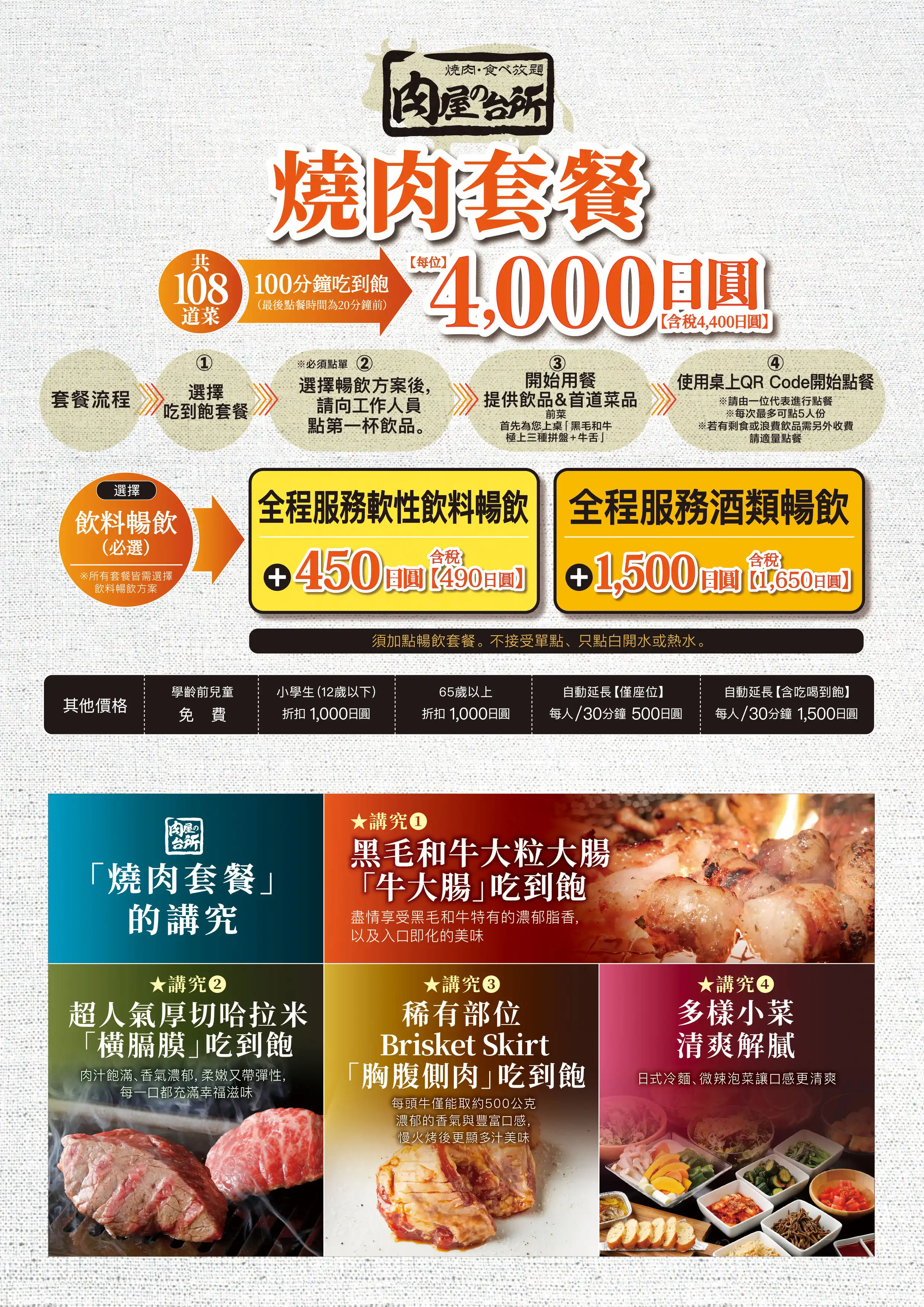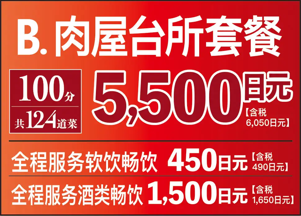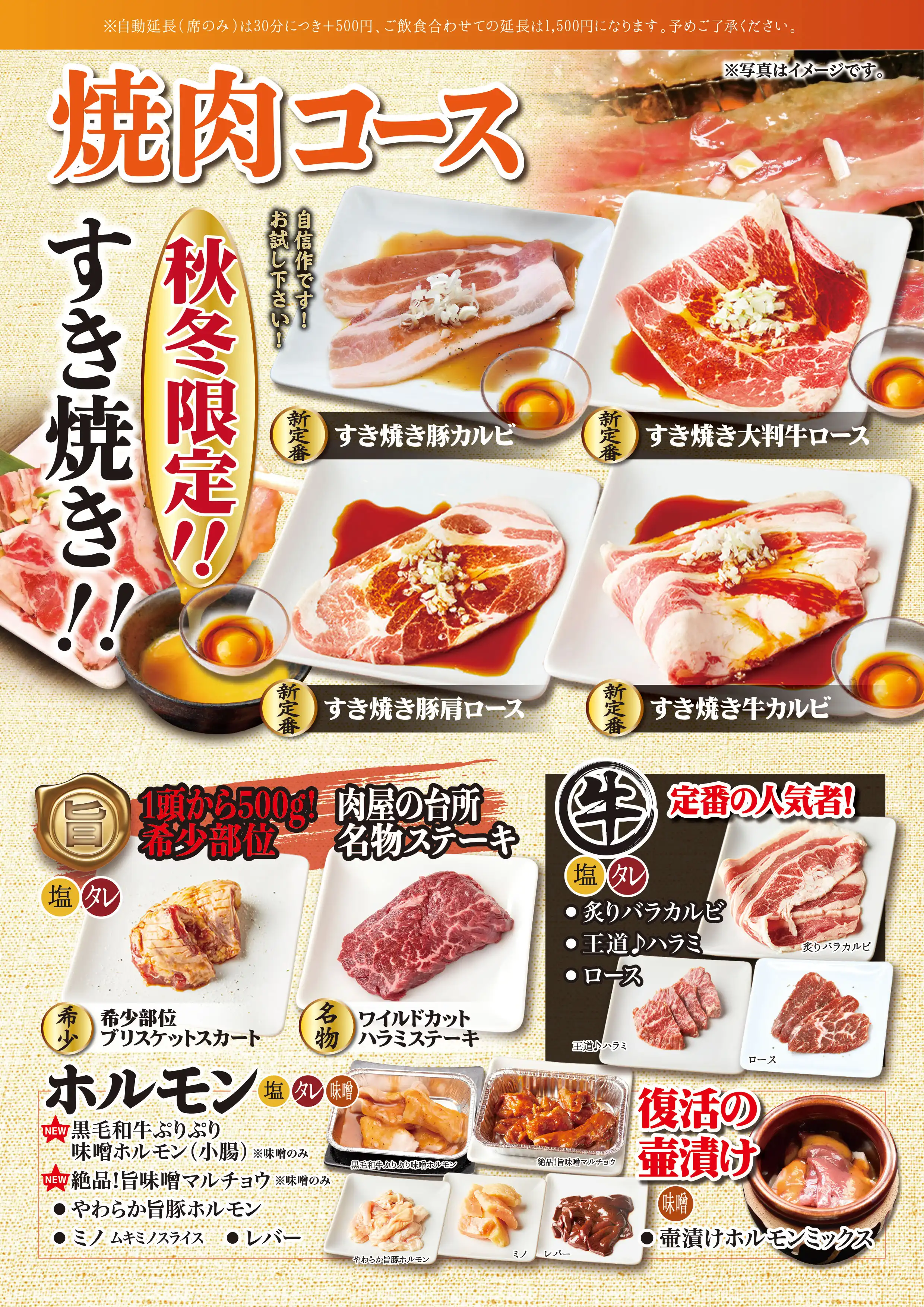 臭みが一切ない黒毛和牛の味噌ホルモンや塊肉の牛ハラミステーキ、この時期おすすめのすき焼き風焼肉などが食べ放題でお楽しみいただけます。ホイル焼きや締めのラーメンなどサイドメニューのバラエティも豊かなコースです席時間100分制LO80分ーーーーーーーー【飲み放題料金】※必ずつけていただいており、詳細は当日ご案内させていただきます。(通常価格)ソフトドリンク450円(税込490円)アルコール:1,500円(税込1,650円)(LINE友達価格)ソフトドリンク350円(税込380円)アルコール:750円(税込820円)