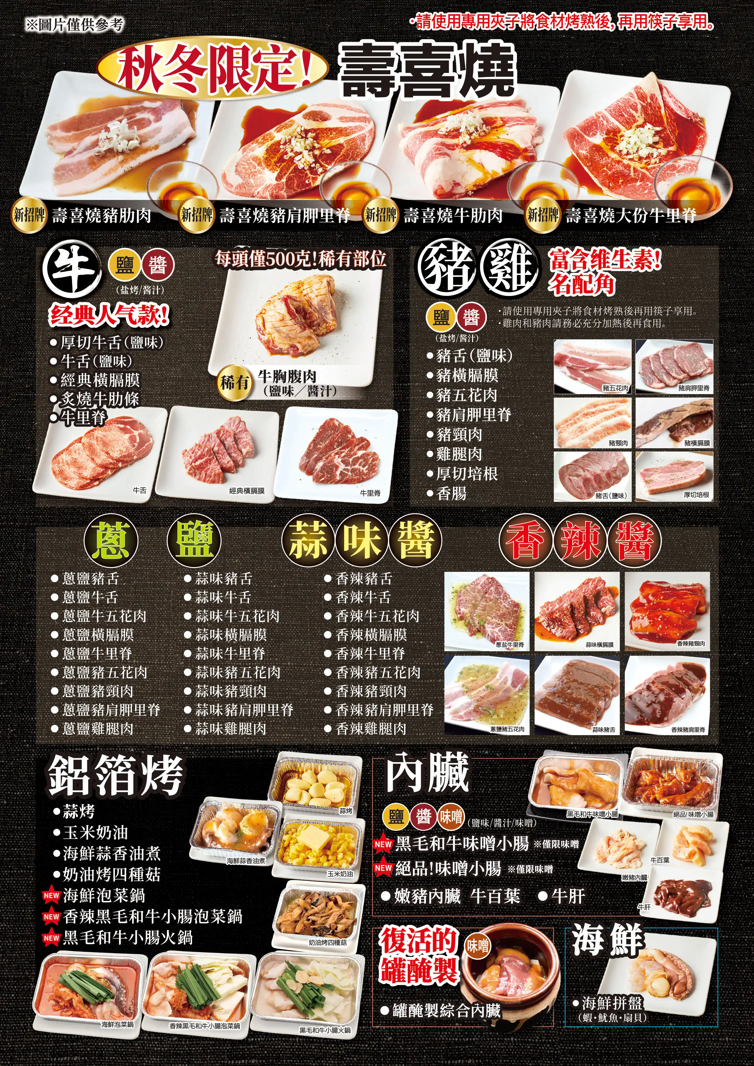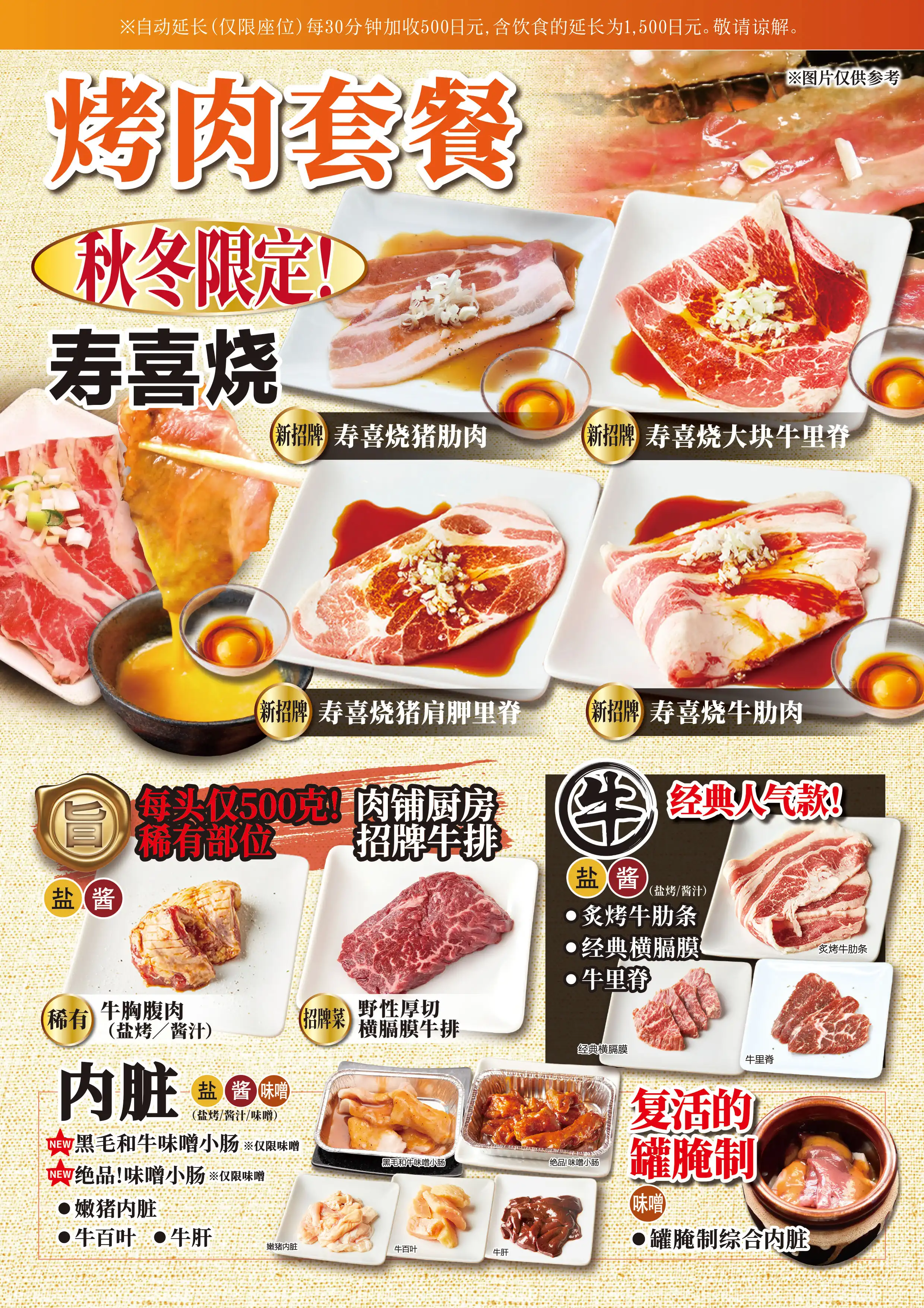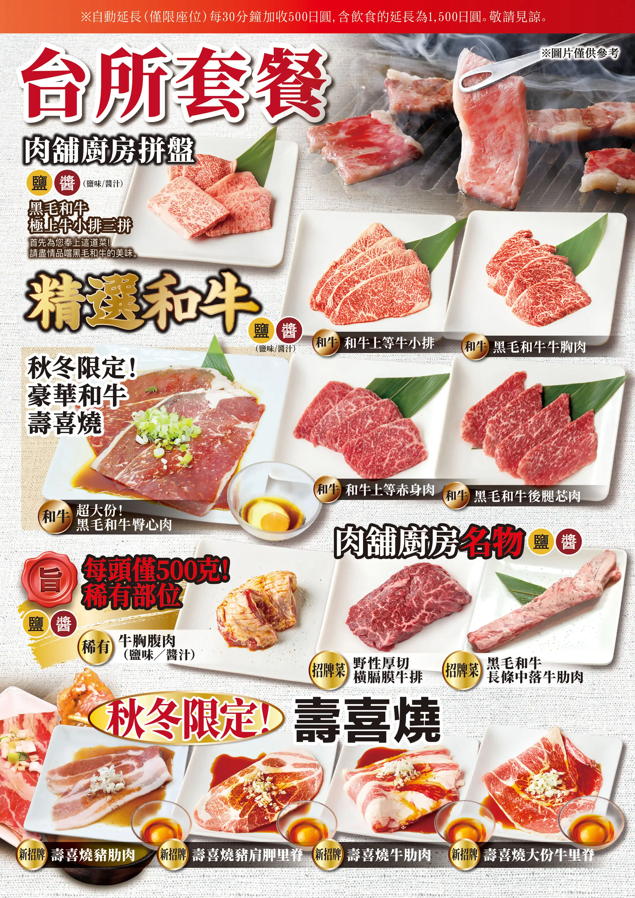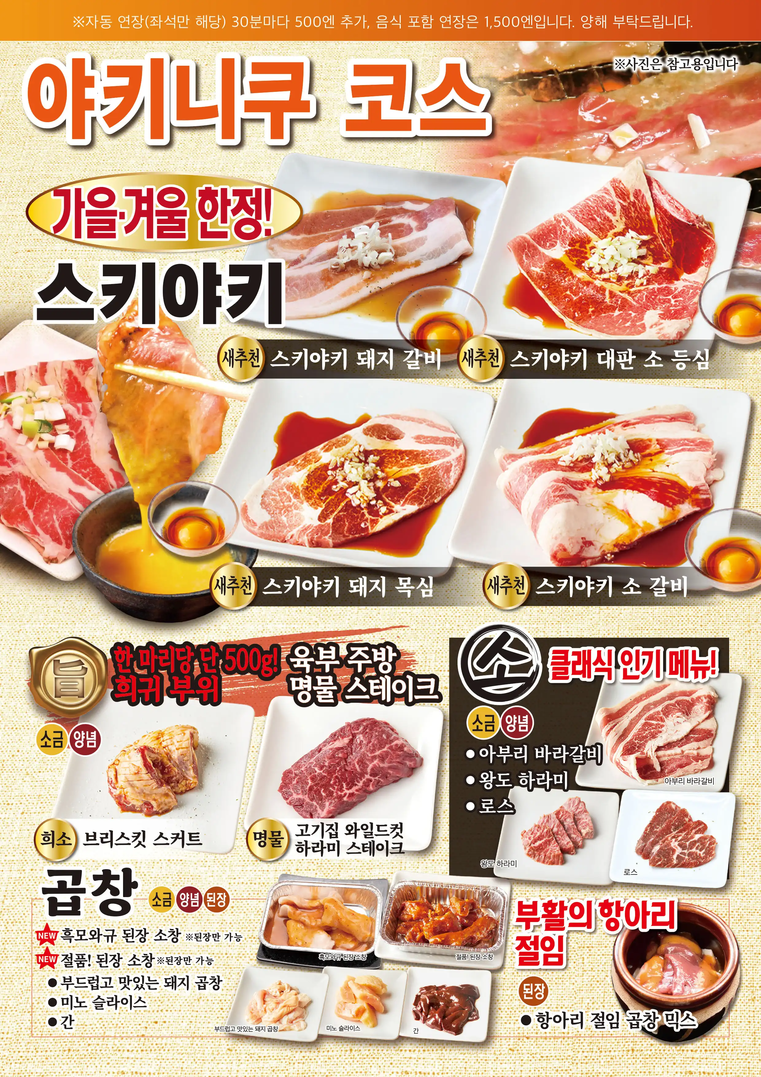 臭みが一切ない黒毛和牛の味噌ホルモンや塊肉の牛ハラミステーキ、この時期おすすめのすき焼き風焼肉などが食べ放題でお楽しみいただけます。ホイル焼きや締めのラーメンなどサイドメニューのバラエティも豊かなコースです席時間100分制LO80分ーーーーーーーー【飲み放題料金】※必ずつけていただいており、詳細は当日ご案内させていただきます。(通常価格)ソフトドリンク450円(税込490円)アルコール:1,500円(税込1,650円)(LINE友達価格)ソフトドリンク350円(税込380円)アルコール:750円(税込820円)