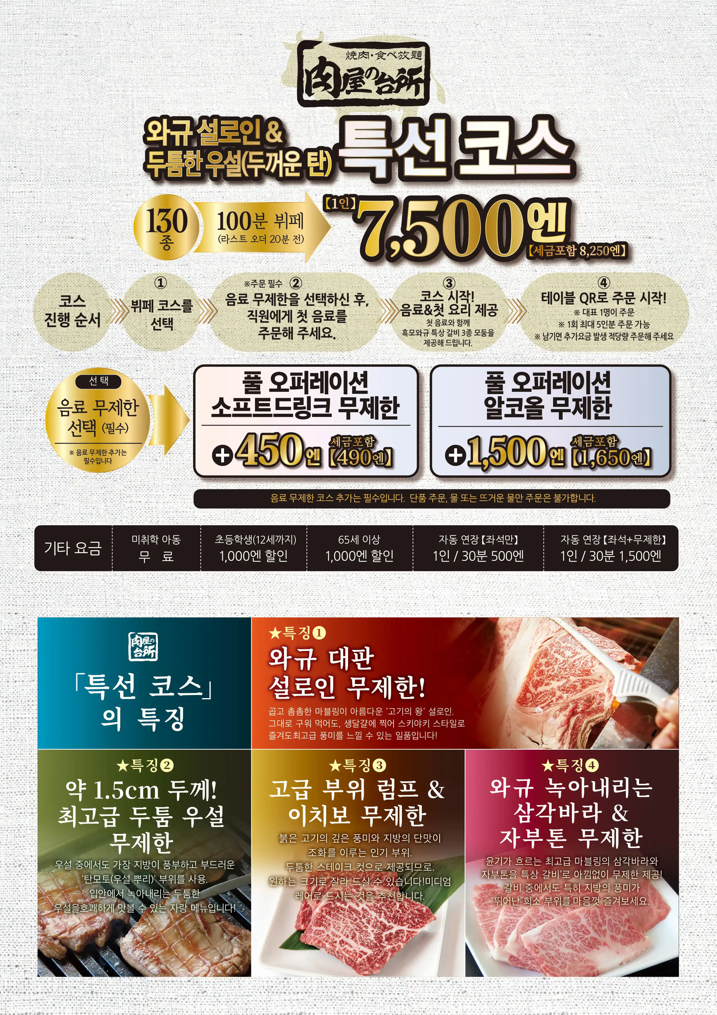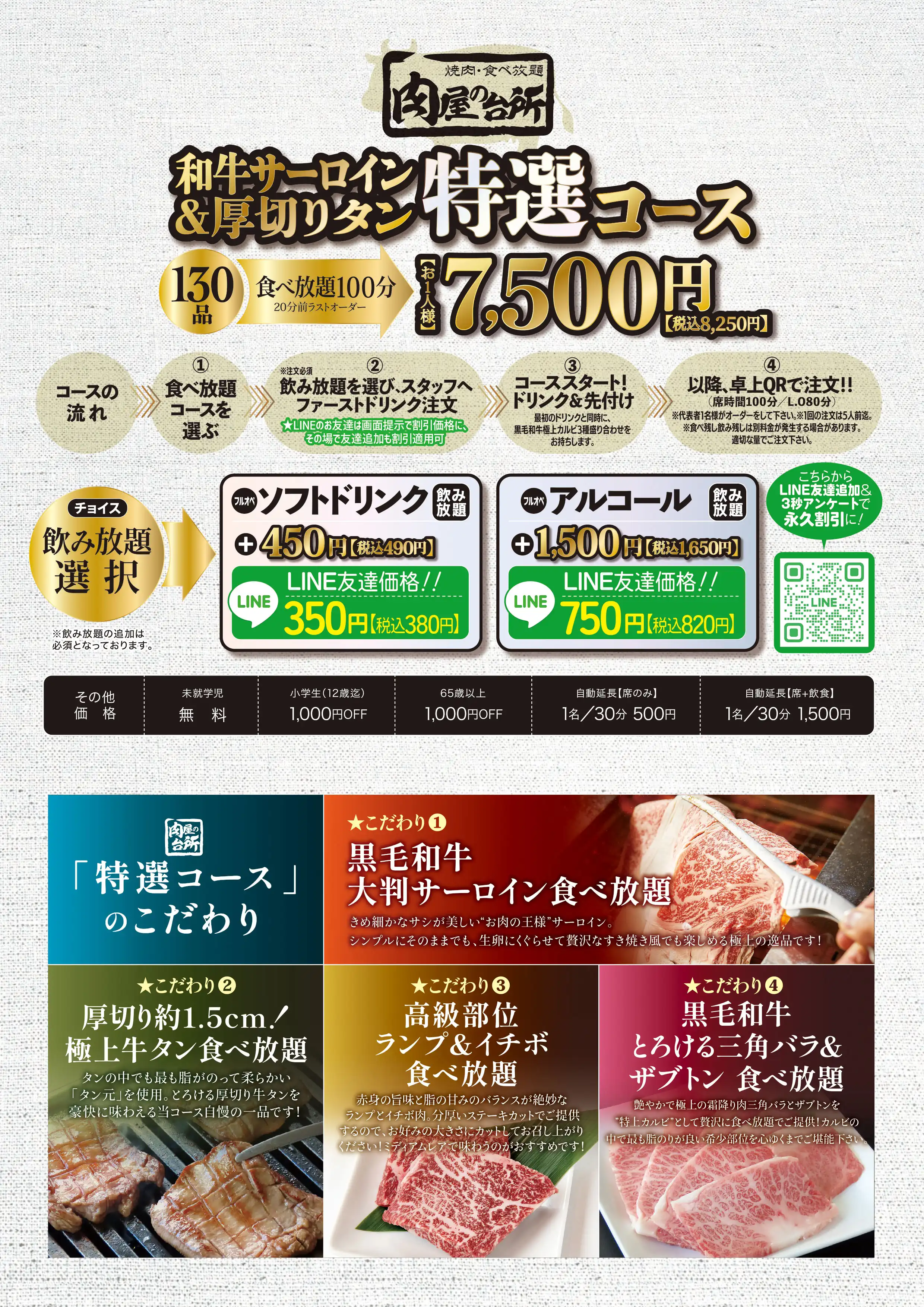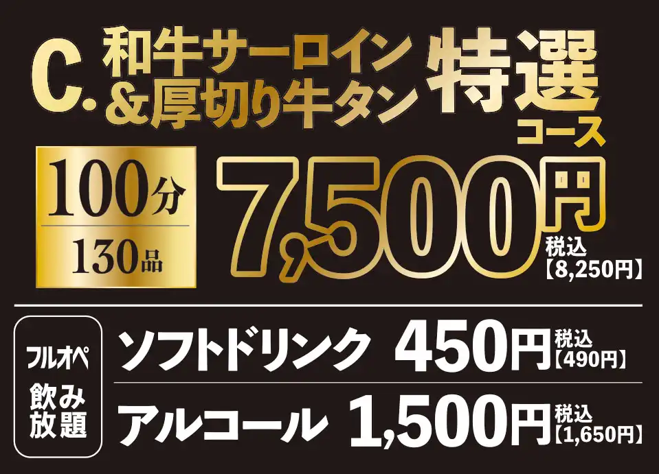 高級部位である黒毛和牛ランプやイチボ、きめ細かい霜が降った黒毛和牛サーロイン、圧倒的迫力のとろける厚切り牛タンなどが全て食べ放題に含まれる高級感あふれるコースです。事前予約で和牛肉パフェを無料サービスしております。ご希望のメッセージを添えて大切な記念日を彩ります。席時間100分制LO80分ーーーーーー【飲み放題料金】※必ずつけていただいており、詳細は当日ご案内させていただきます。(通常価格)ソフトドリンク450円(税込490円)アルコール:1,500円(税込1,650円)(LINE友達価格)ソフトドリンク350円(税込380円)アルコール:750円(税込820円)