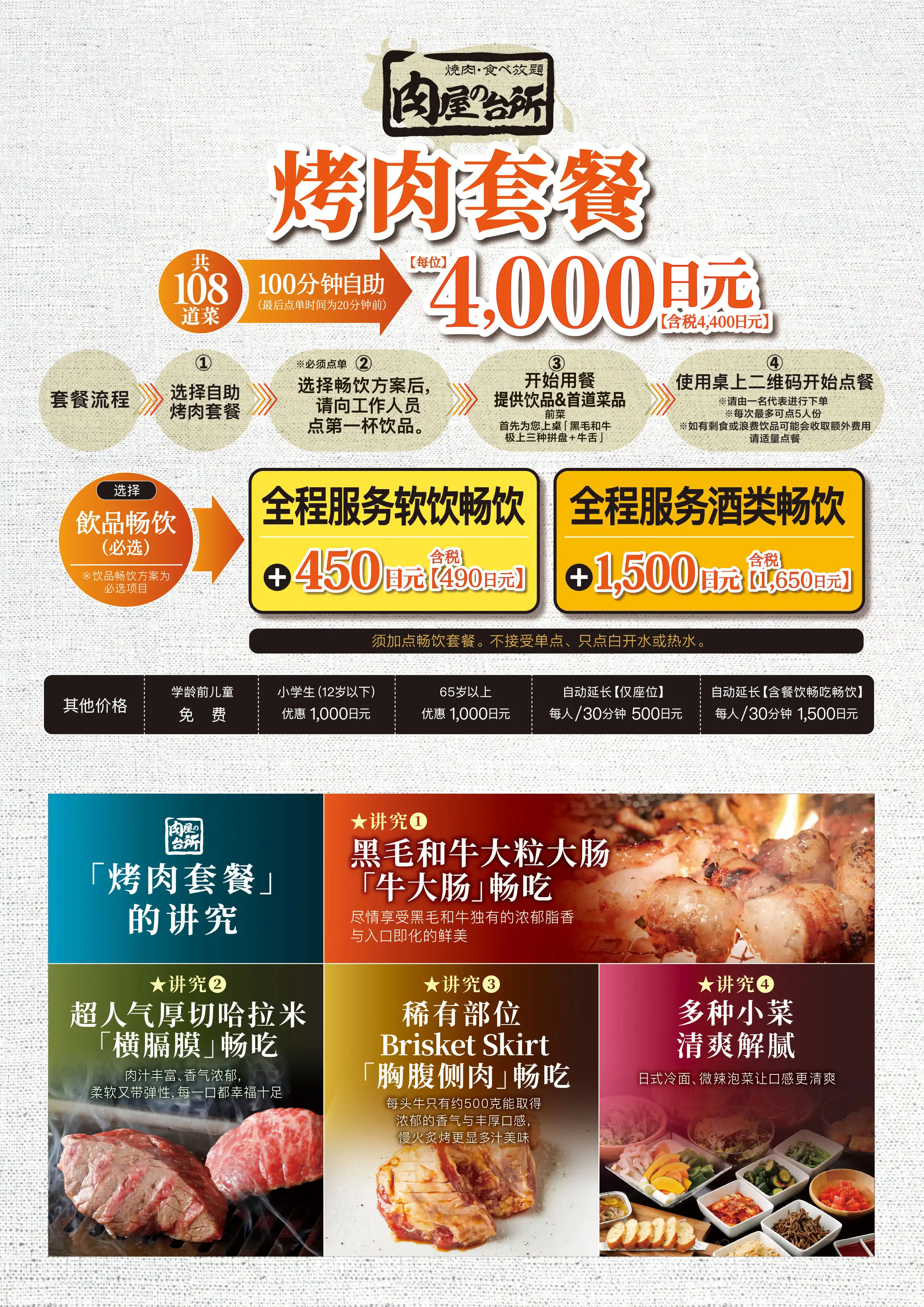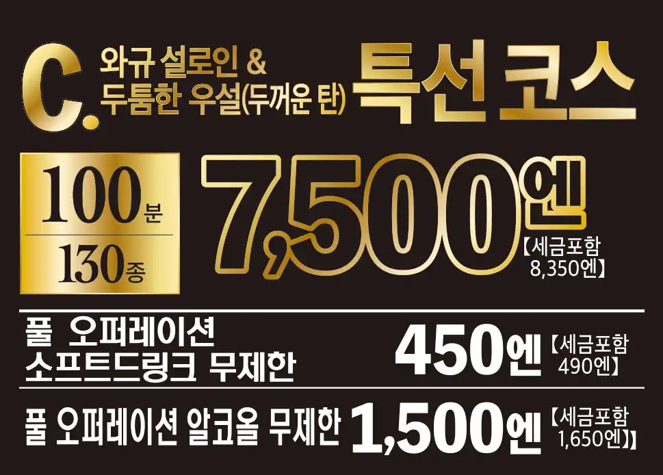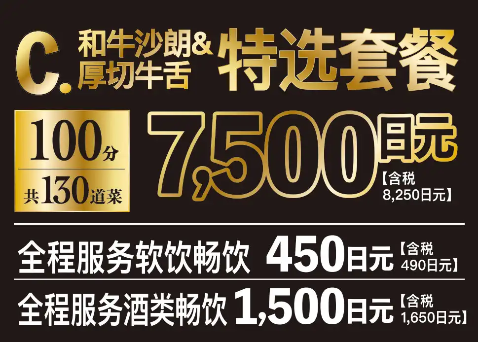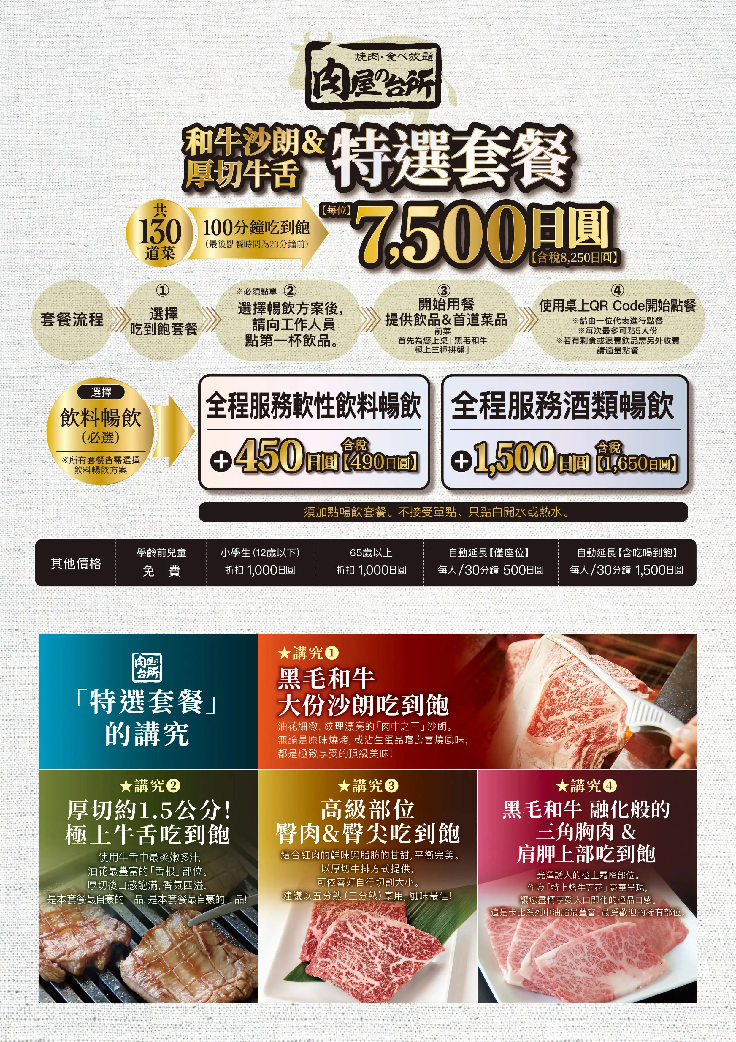 高級部位である黒毛和牛ランプやイチボ、きめ細かい霜が降った黒毛和牛サーロイン、圧倒的迫力のとろける厚切り牛タンなどが全て食べ放題に含まれる高級感あふれるコースです。事前予約で和牛肉パフェを無料サービスしております。ご希望のメッセージを添えて大切な記念日を彩ります。席時間100分制LO80分ーーーーーー【飲み放題料金】※必ずつけていただいており、詳細は当日ご案内させていただきます。(通常価格)ソフトドリンク450円(税込490円)アルコール:1,500円(税込1,650円)(LINE友達価格)ソフトドリンク350円(税込380円)アルコール:750円(税込820円)