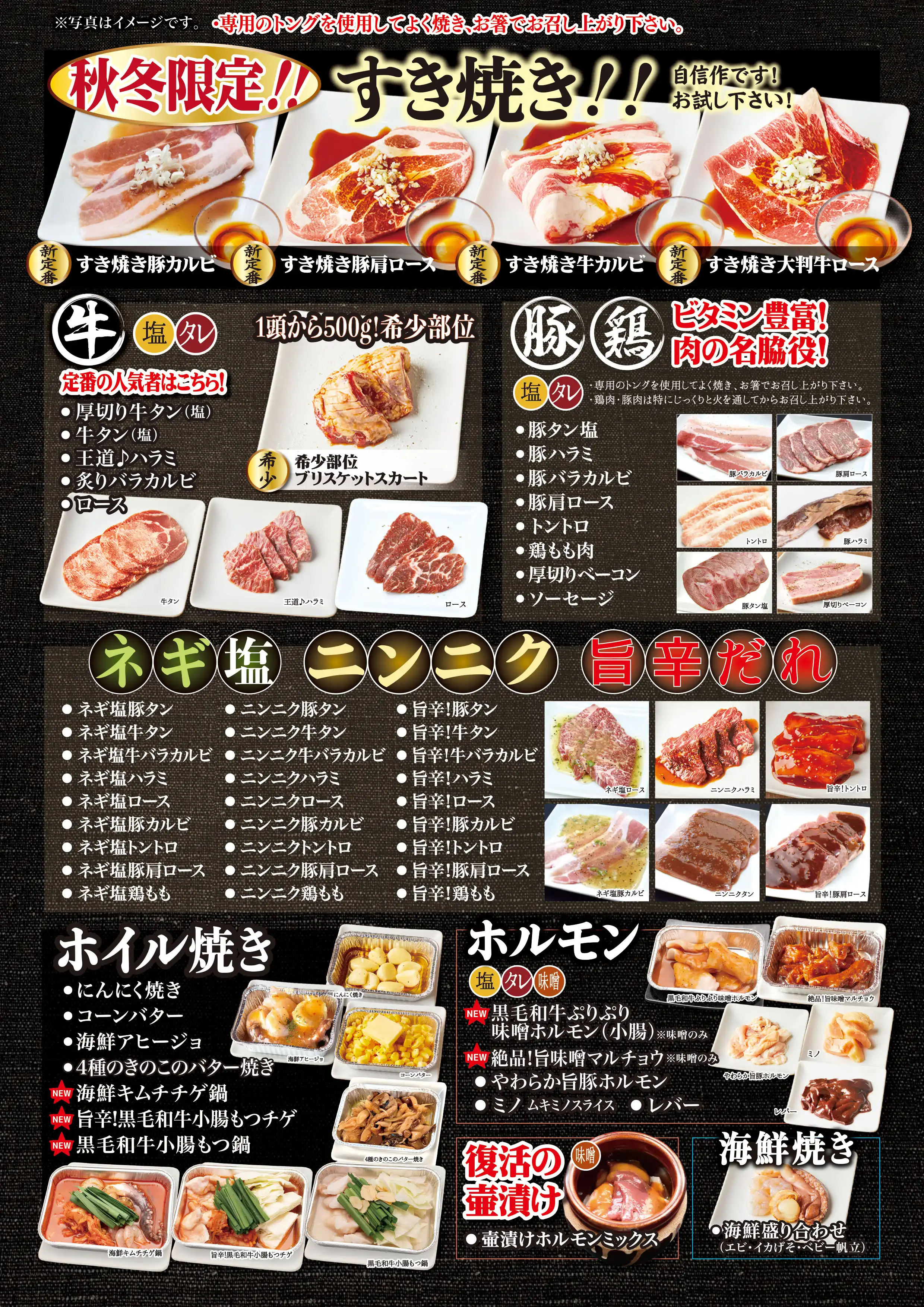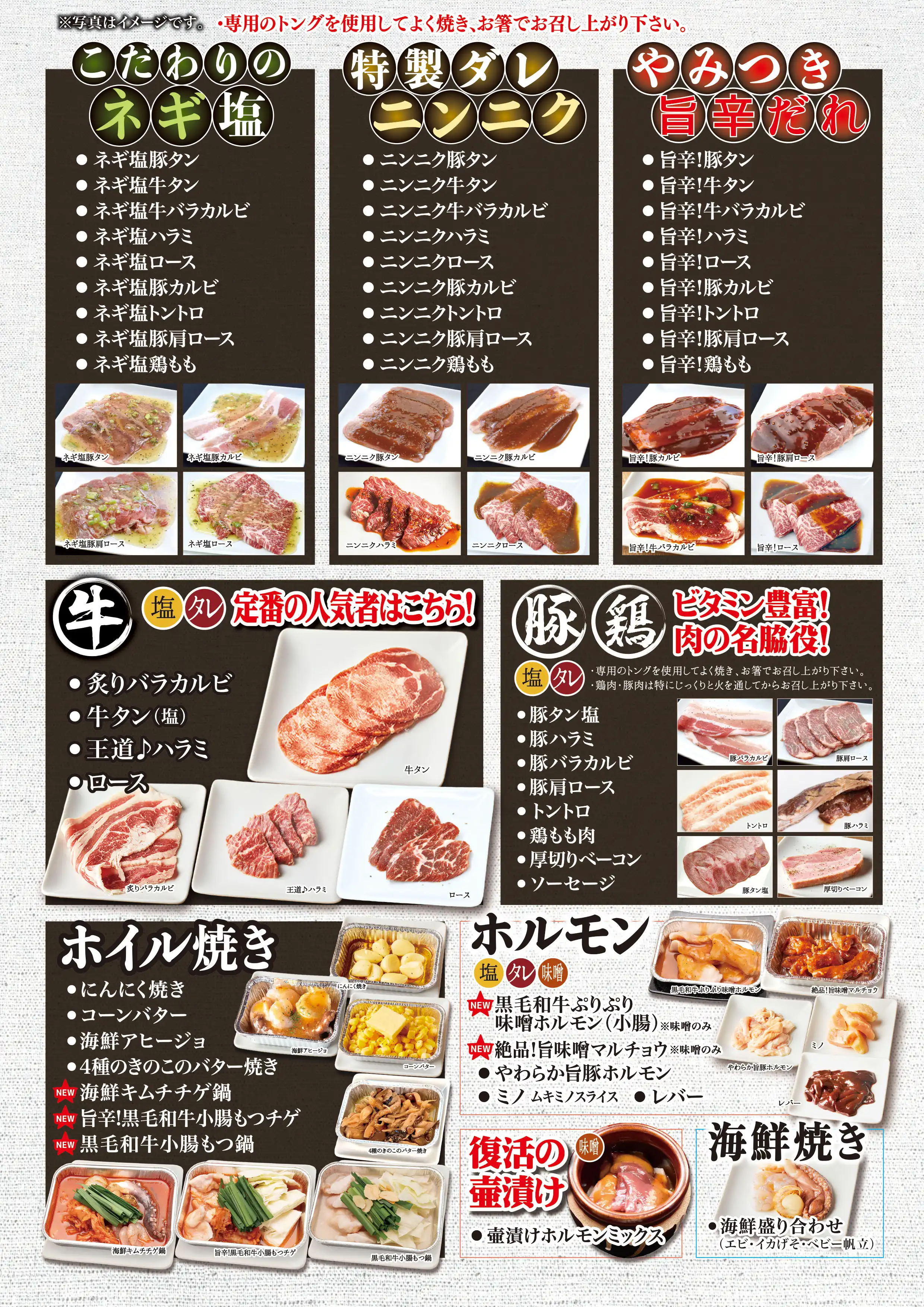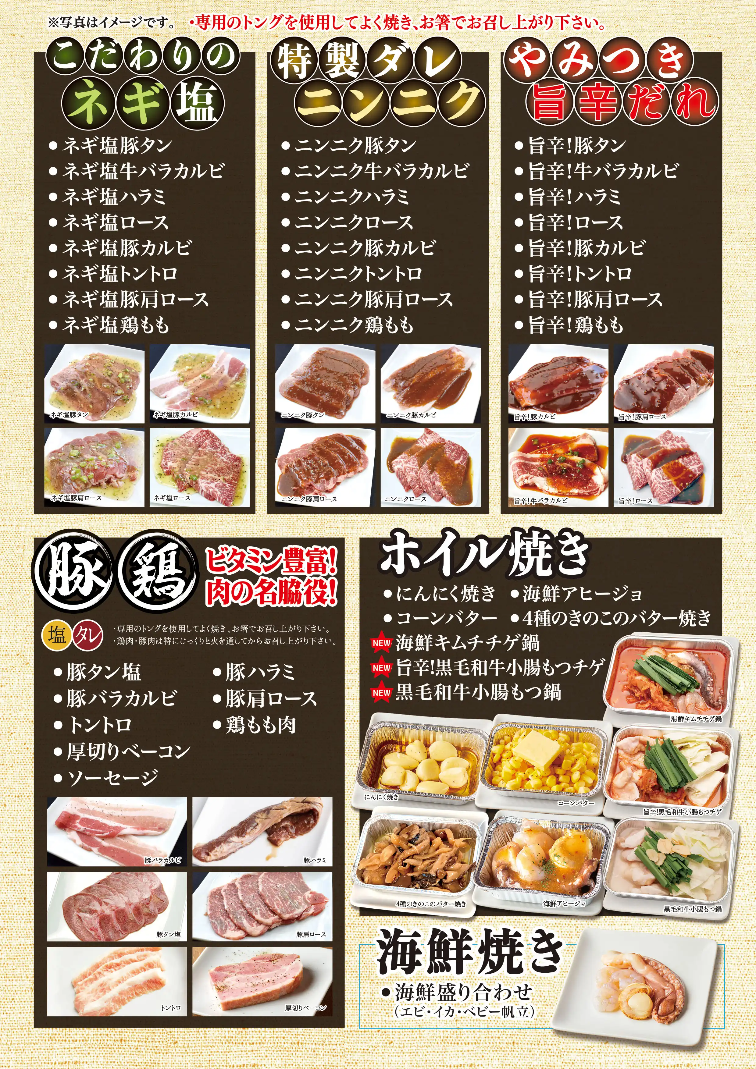 | コース内容 | 【肉屋の台所 名物】(塩・タレ) 肉屋名物ワイルドカットハラミステーキ 【1頭から500g!希少部位】(塩・タレ) 希少部位ブリスケットスカート 【出汁焼きしゃぶ】 出汁焼きしゃぶ牛カルビ/出汁焼きしゃぶ牛ロース/出汁焼きしゃぶ豚カルビ/出汁焼きしゃぶ豚肩ロース 【すき焼き】 すき焼き牛カルビ/すき焼き大判牛ロース/すき焼き豚カルビ/すき焼き豚肩ロース 【牛・豚・鶏】(塩・タレ) 王道ハラミ/炙りバラカルビ/ロース/豚タン/豚ハラミ/豚バラカルビ/豚肩ロース/トントロ/鶏もも/厚切りベーコン/ソーセージ 【復活の壷漬け】 壷漬けホルモンミックス 【ホルモン】(塩・タレ・味噌) やわらか旨豚ホルモン/ミノ/黒毛和牛ぷりぷり味噌ホルモン(小腸)/絶品!旨味噌マルチョウ/レバー 【ネギ塩】 ハラミ/タン/牛バラカルビ/ロース/豚カルビ/トントロ/豚肩ロース/鶏もも 【ニンニクだれ】 ハラミ/タン/牛バラカルビ/ロース/豚カルビ/トントロ/豚肩ロース/鶏もも 【旨辛だれ】 ハラミ/タン/牛バラカルビ/ロース/豚カルビ/トントロ/豚肩ロース/鶏もも 【サイドメニュー】 手仕込み白菜生キムチ/カクテキ/キムチ盛り合わせ/オイキムチ/もやしナムル/小松菜ナムル/シーザーサラダ/肉屋のサラダ(特製塩ごまだれ)/まき野菜/塩だれキャベツ/おつまみメンマ/ポテトサラダ/ごはん/肉屋のカレー/一口冷麺一/口冷麺(梅味)/コムタンスープ/韓国のり/おつまみうずら/チヂミ/ビビンバ 【肉屋のTKGシリーズ】 肉屋のTKG しょうゆ・塩/肉屋のTKGネギ油 【焼き野菜・ホイル焼き】 焼き野菜盛り/にんにく焼き/4種のきのこのバター焼き/コーンバター/海鮮アヒージョ/ヤンニョム海鮮盛り 【海鮮】 海鮮盛り合せ(エビ・イイダコ・ホタテ) 【デザート】 杏仁豆腐/フルーツポンチ 生チョコアイス・チョコ 生チョコアイス・バニラ 生チョコアイス・抹茶 |