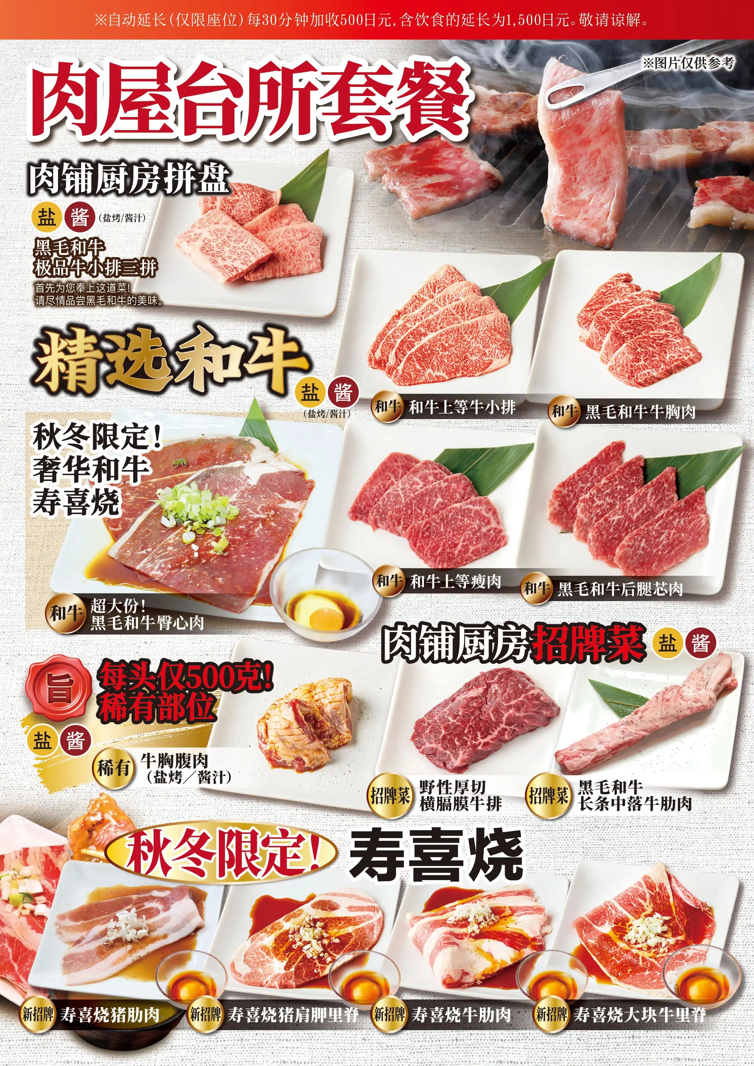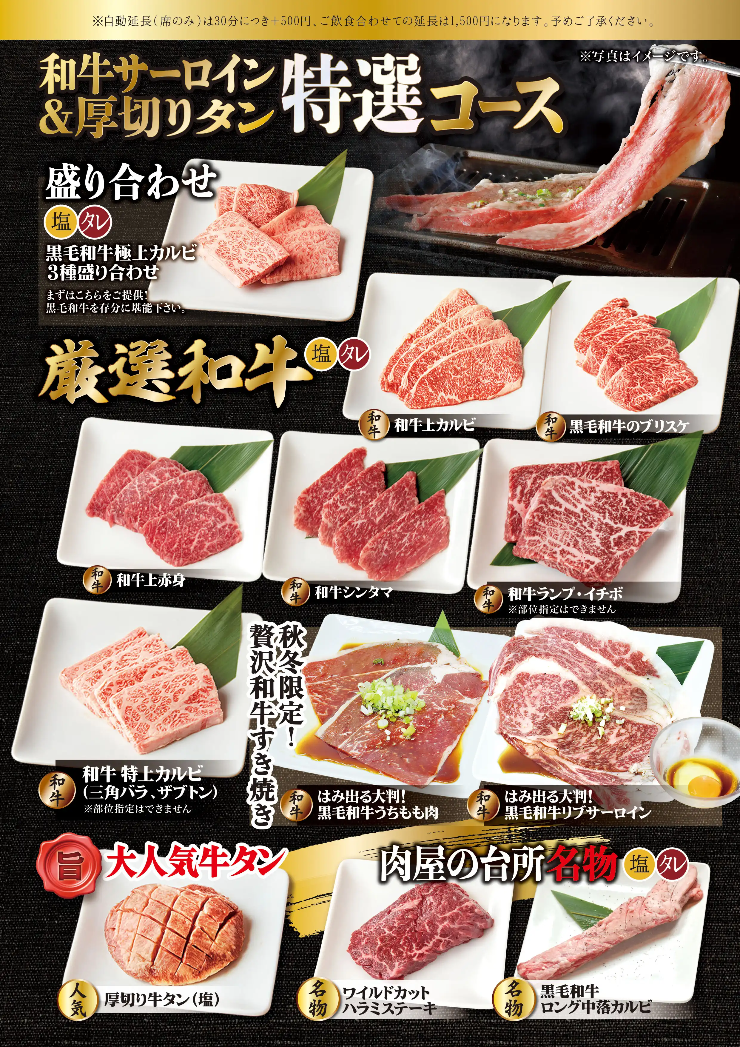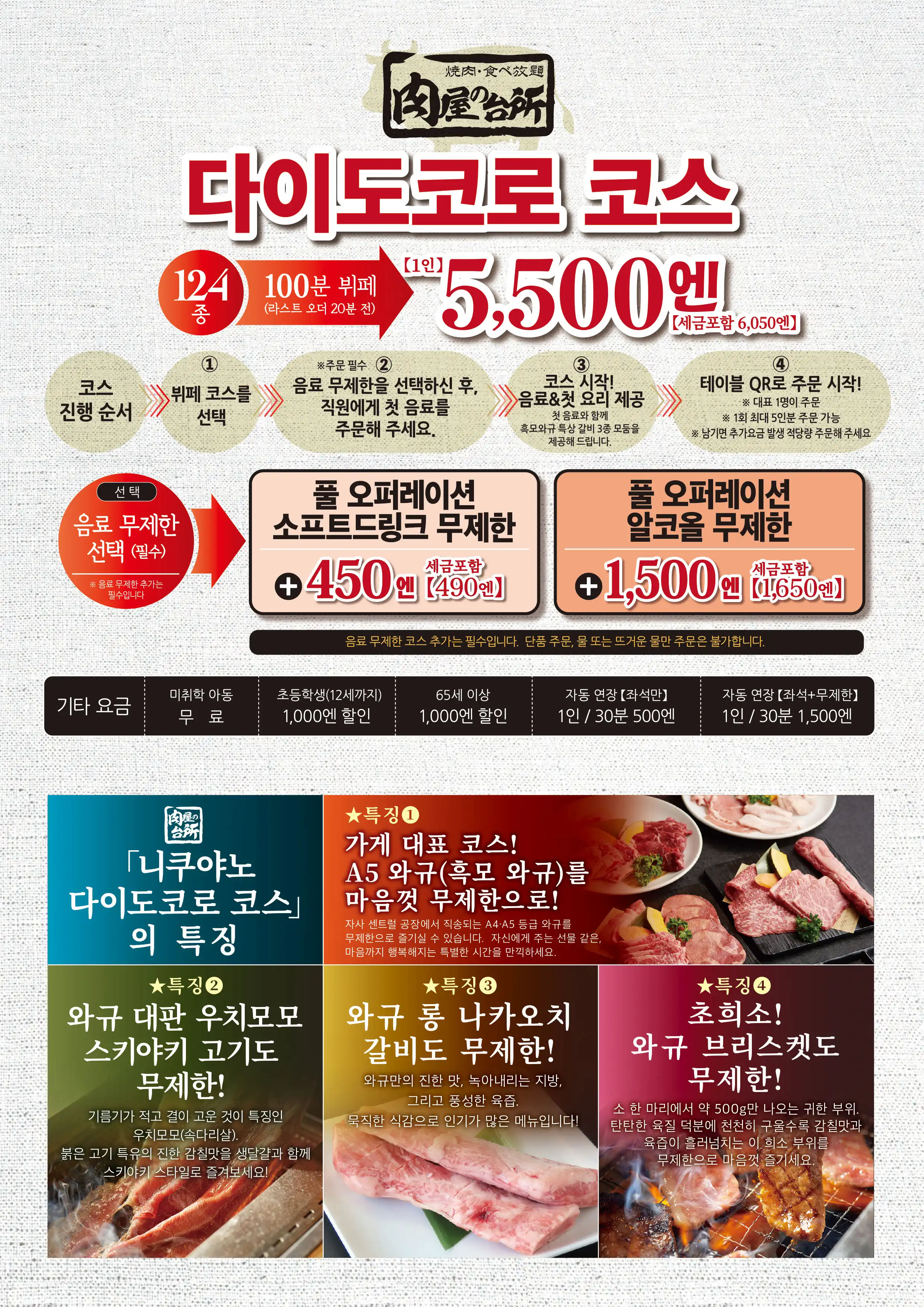 | コース内容 | <食べ放題MENU> 【 A5黒毛和牛 】 極上カルビ3種盛り合わせ (三角ばら/ザブトン/上カルビ/ブリスケ)うち三種 和牛ロング中落カルビ、和牛上カルビ、和牛ブリスケットスカート、和牛上赤身、和牛シンタマ、和牛大判うちもも肉 【1頭から500gの希少部位】 希少部位ブリスケットスカート 【秋冬限定すき焼き風焼肉】 和牛大判サーロイン、和牛大判うちもも肉、牛カルビ、大判牛ロース、豚カルビ、豚肩ロース 【牛肉】 炙りバラカルビ、牛タン、ハラミ、大判ロース 【ホルモン】 黒毛和牛ぷりぷり味噌ホルモン(小腸)、壺漬けホルモンミックス、やわらか旨豚ホルモン 、ムキミノスライス、絶品!旨味噌マルチョウ、レバー 【豚・鶏】 (塩/タレ/ニンニクだれ/ねぎ塩だれ/旨辛ダレ) 豚タン、豚ハラミ、豚バラカルビ、豚肩ロース、トントロ、鶏もも、厚切りベーコン、ソーセージ、 【サイドメニュー】 白菜キムチ、カクテキ、キムチ盛り合わせ、オイキムチ、ナムルミックス、シーザーサラダ、肉屋の台所特製塩ごまだれサラダ、蒸し鶏ゴマダレサラダ、まき野菜、塩だれキャベツ、ポテトサラダ、韓国のり、おつまみうずら、チヂミ 【ホイル焼き】 にんにく焼き、4種のきのこのバター焼き、コーンバター、海鮮アヒージョ 【〆・ご飯もの】 肉屋の自家製肉味噌ビビンバ、ごはん、肉屋台所カレー、一口冷麺(梅味)、一口冷麺、コムタンスープ、海鮮キムチチゲ鍋、旨辛!黒毛和牛小腸もつチゲ、黒毛和牛小腸もつ鍋、ピリ辛チゲラーメン、貝出汁香る魚介塩ラーメン 【肉屋のTKGシリーズ】 肉屋のTKG しょうゆ、肉屋のTKG塩、肉屋の自家製肉味噌TKG、肉屋のTKGネギ油 【焼き野菜】 焼き野菜盛り合わせ 【海鮮焼き】 海鮮盛り合せ(エビ・イカ・ホタテ) 【デザート】 杏仁豆腐、フルーツポンチ 豪華パフェアイス★1人1つ (抹茶バニラ/マンゴーバニラ/チョコバニラ) |