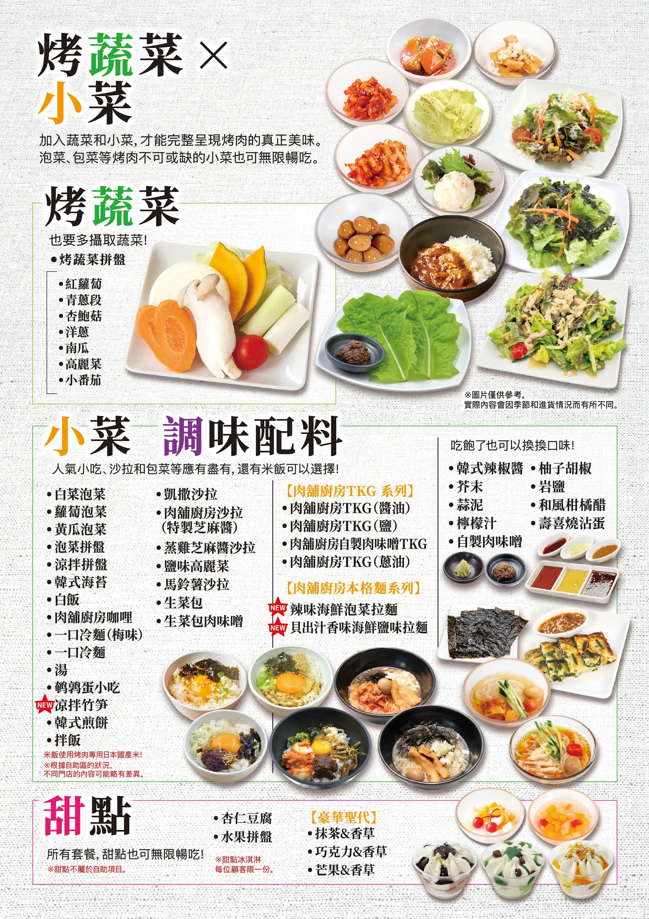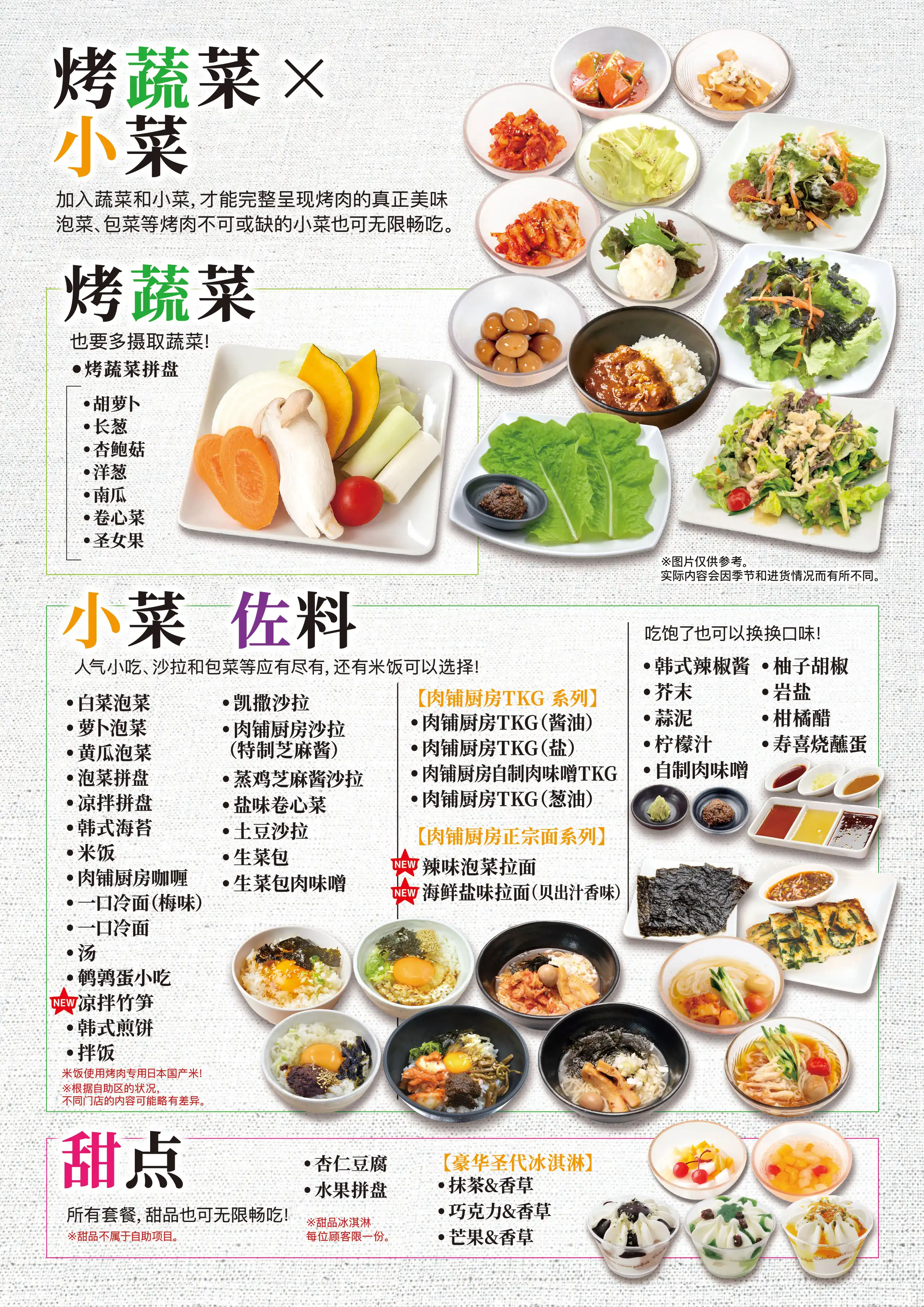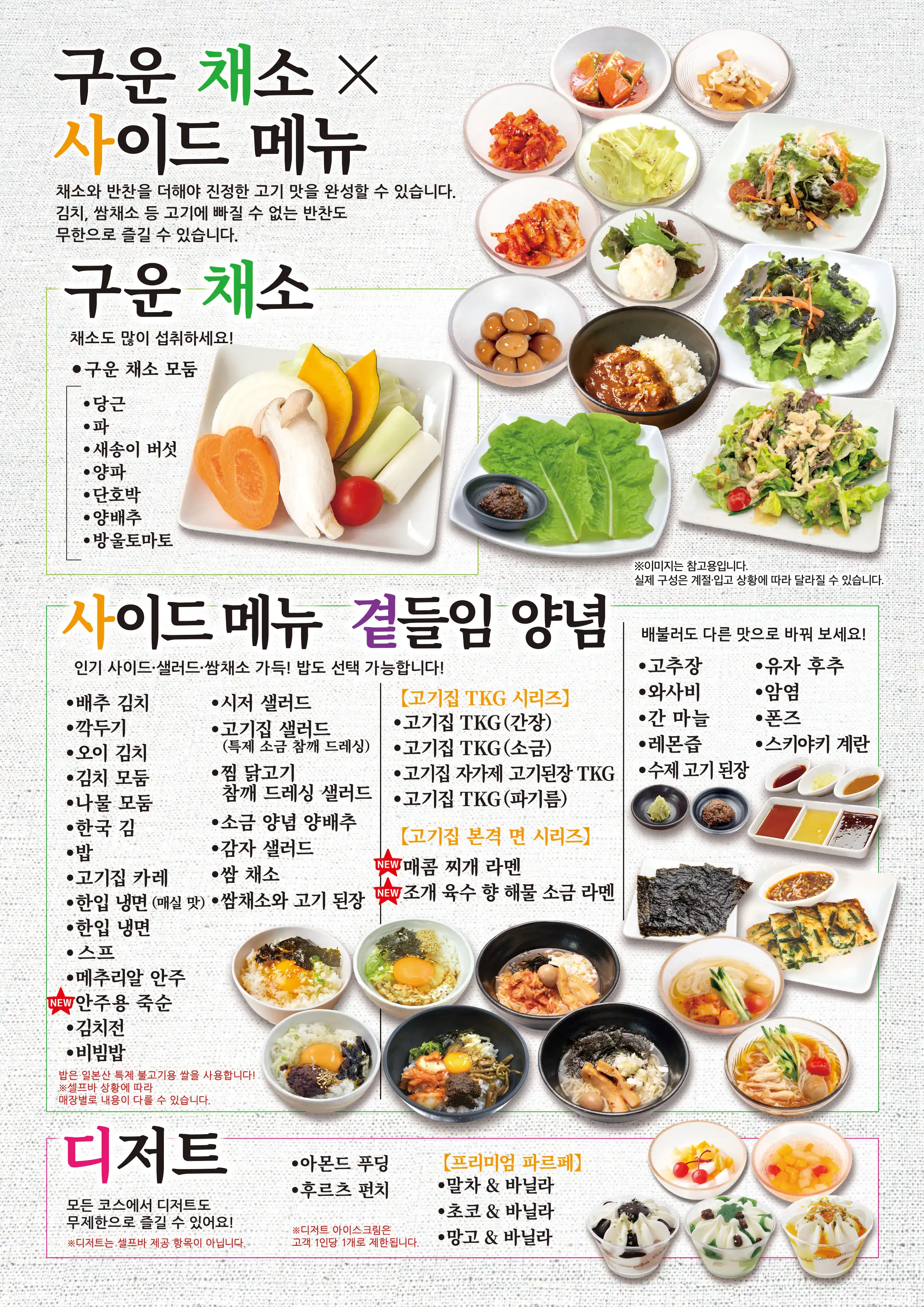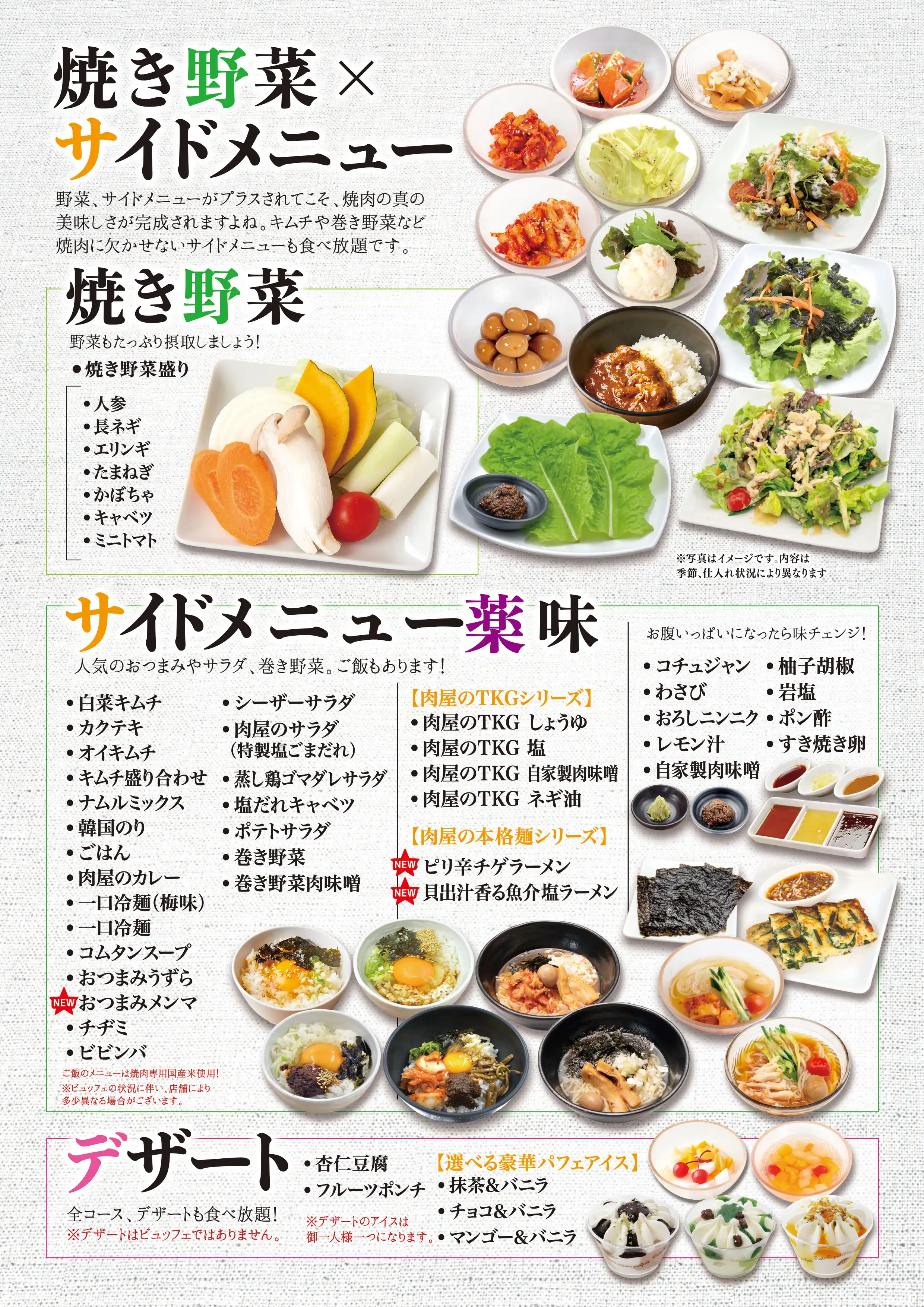 | コース内容 | <食べ放題MENU> 【 A5和牛希少部位 】 和牛ランプ・イチボ 和牛大判サーロイン 和牛特上カルビ(三角バラ/サブトン) 【 A5黒毛和牛 】 極上カルビ3種盛り合わせ (三角ばら/ザブトン/上カルビ/ブリスケ)うち三種 和牛ロング中落カルビ 和牛上カルビ 和牛ブリスケットスカート 和牛上赤身 和牛シンタマ 和牛大判うちもも肉 和牛ぷりぷり味噌ホルモン(小腸) 【1頭から500gの希少部位】 希少部位ブリスケットスカート 【秋冬限定すき焼き風焼肉】 和牛大判うちもも肉 牛カルビ 大判牛ロース 豚カルビ 豚肩ロース 【牛肉】 ワイルドカットハラミステーキ 厚切り牛タン 以下商品選べるソース(塩/タレ/ニンニクだれ/ねぎ塩だれ/旨辛ダレ) 牛タン 牛ハラミ 炙りバラカルビ 大判ロース 【ホルモン】 黒毛和牛ぷりぷり味噌ホルモン(小腸) 壺漬けホルモンミックス やわらか旨豚ホルモン ムキミノスライス 絶品!旨味噌マルチョウ レバー 【豚・鶏】 味付け豚ハラミ 以下商品選べるソース(塩/タレ/ニンニクだれ/ねぎ塩だれ/旨辛ダレ) 豚タン 豚バラカルビ 豚肩ロース トントロ 鶏もも 【サイドメニュー】 厚切りベーコン ソーセージ 白菜キムチ カクテキ キムチ盛り合わせ オイキムチ ナムルミックス シーザーサラダ 肉屋の台所特製塩ごまだれサラダ 蒸し鶏ゴマダレサラダ まき野菜 塩だれキャベツ ポテトサラダ 韓国のり おつまみうずら チヂミ おつまみメンマ 【ホイル焼き】 にんにく焼き 4種のきのこのバター焼き コーンバター 海鮮アヒージョ 【〆・ご飯もの】 肉屋の自家製肉味噌ビビンバ ごはん 肉屋台所カレー 一口冷麺(梅味) 一口冷麺 コムタンスープ 海鮮キムチチゲ鍋 旨辛!黒毛和牛小腸もつチゲ 黒毛和牛小腸もつ鍋 ピリ辛チゲラーメン 貝出汁香る魚介塩ラーメン 【肉屋のTKGシリーズ】 肉屋のTKG しょうゆ 肉屋のTKG塩 肉屋の自家製肉味噌TKG 肉屋のTKGネギ油 【焼き野菜】 焼き野菜盛り合わせ 【海鮮焼き】 海鮮盛り合せ(エビ・イカ・ホタテ) 【デザート】 杏仁豆腐 フルーツポンチ 豪華パフェアイス★1人1つ (抹茶バニラ/マンゴーバニラ/チョコバニラ) |