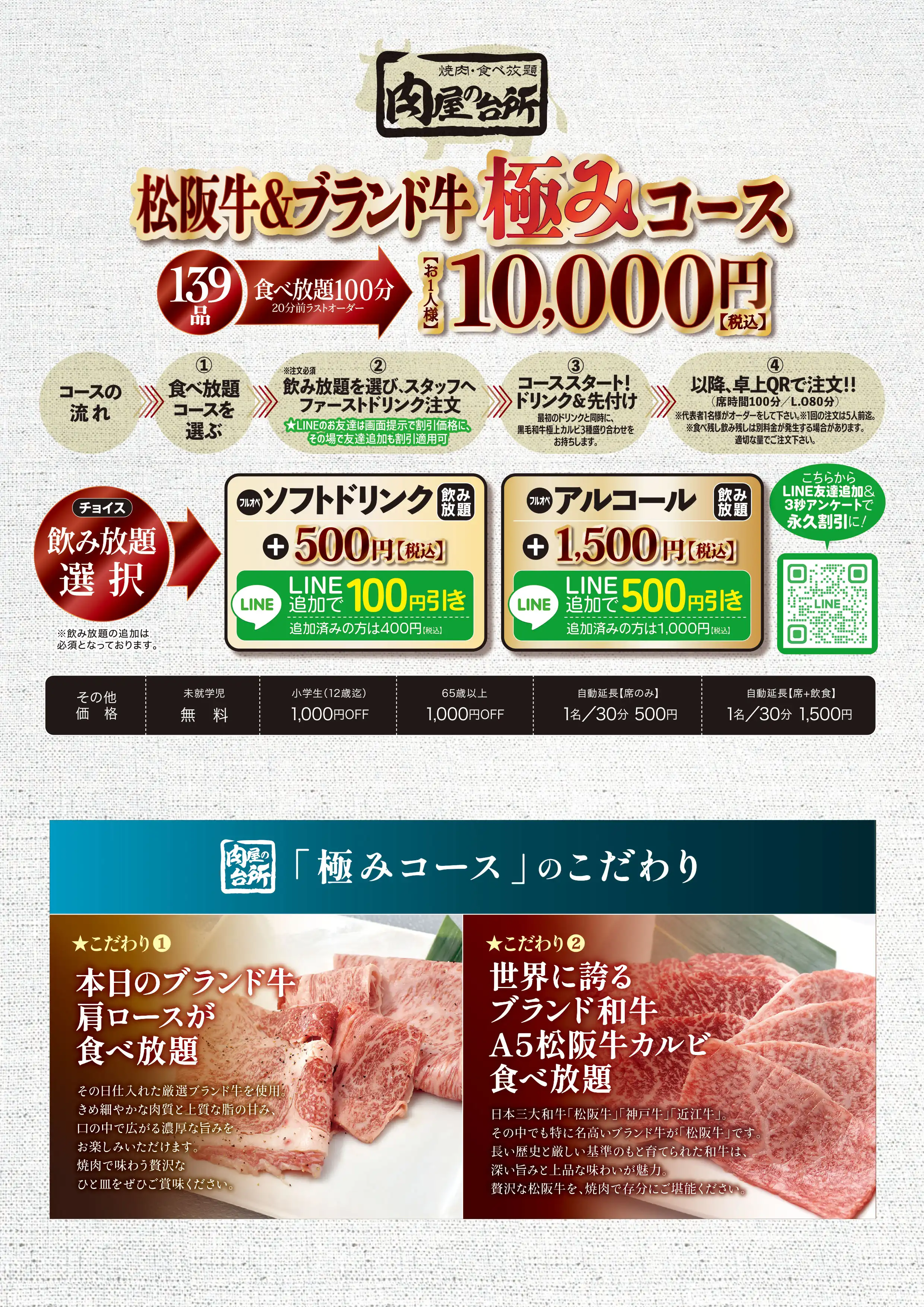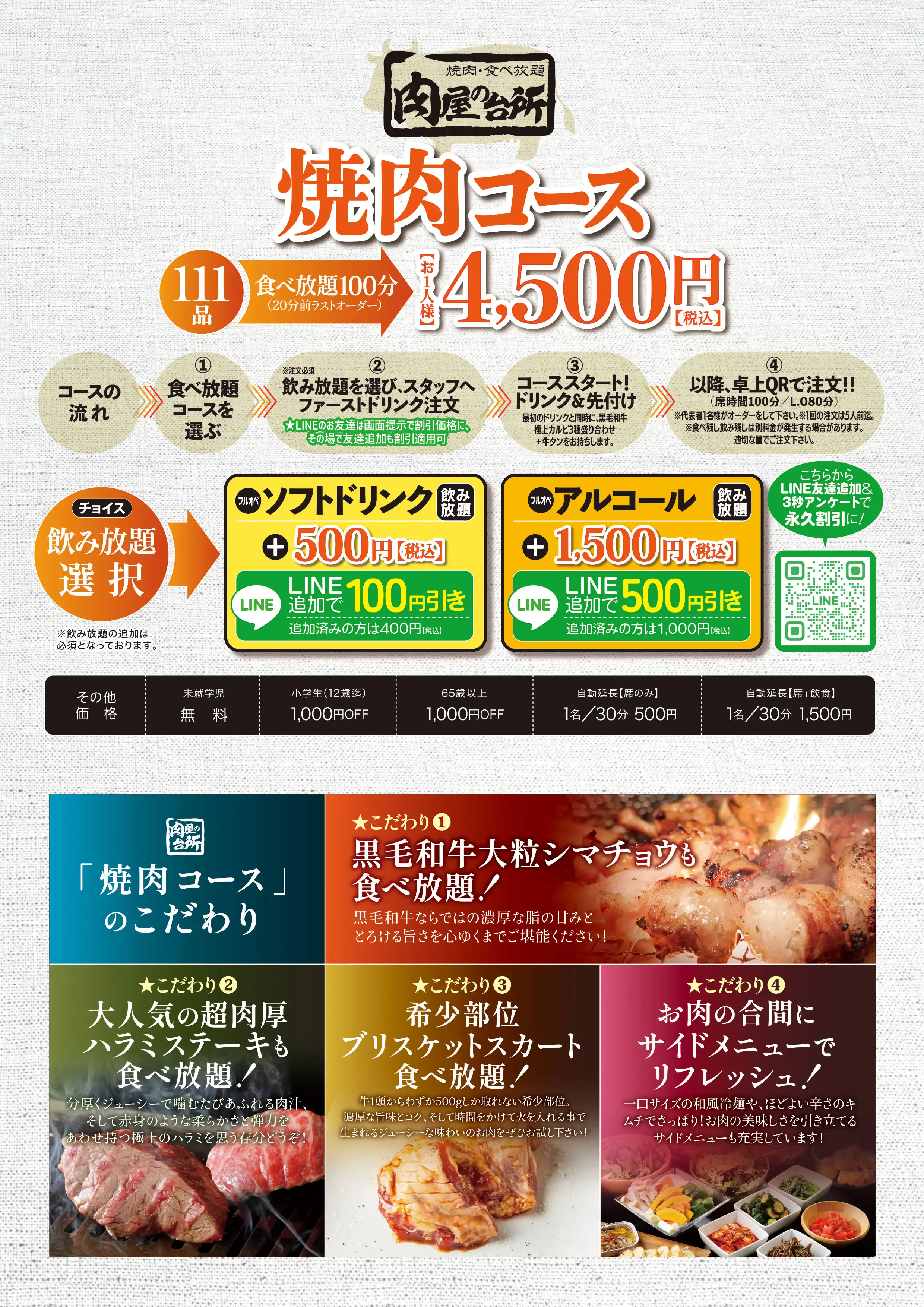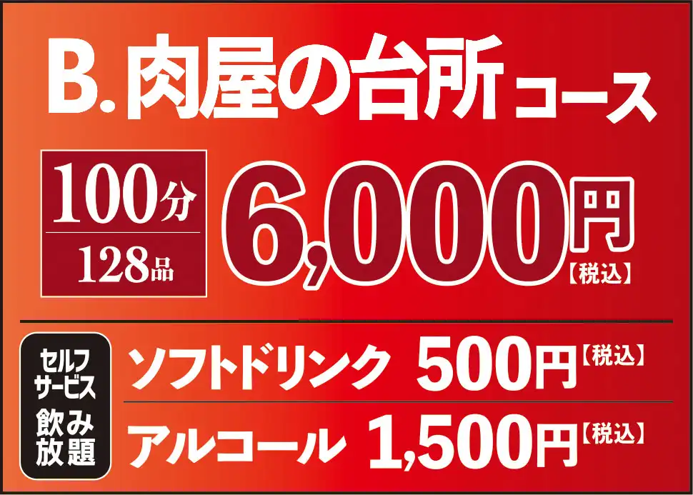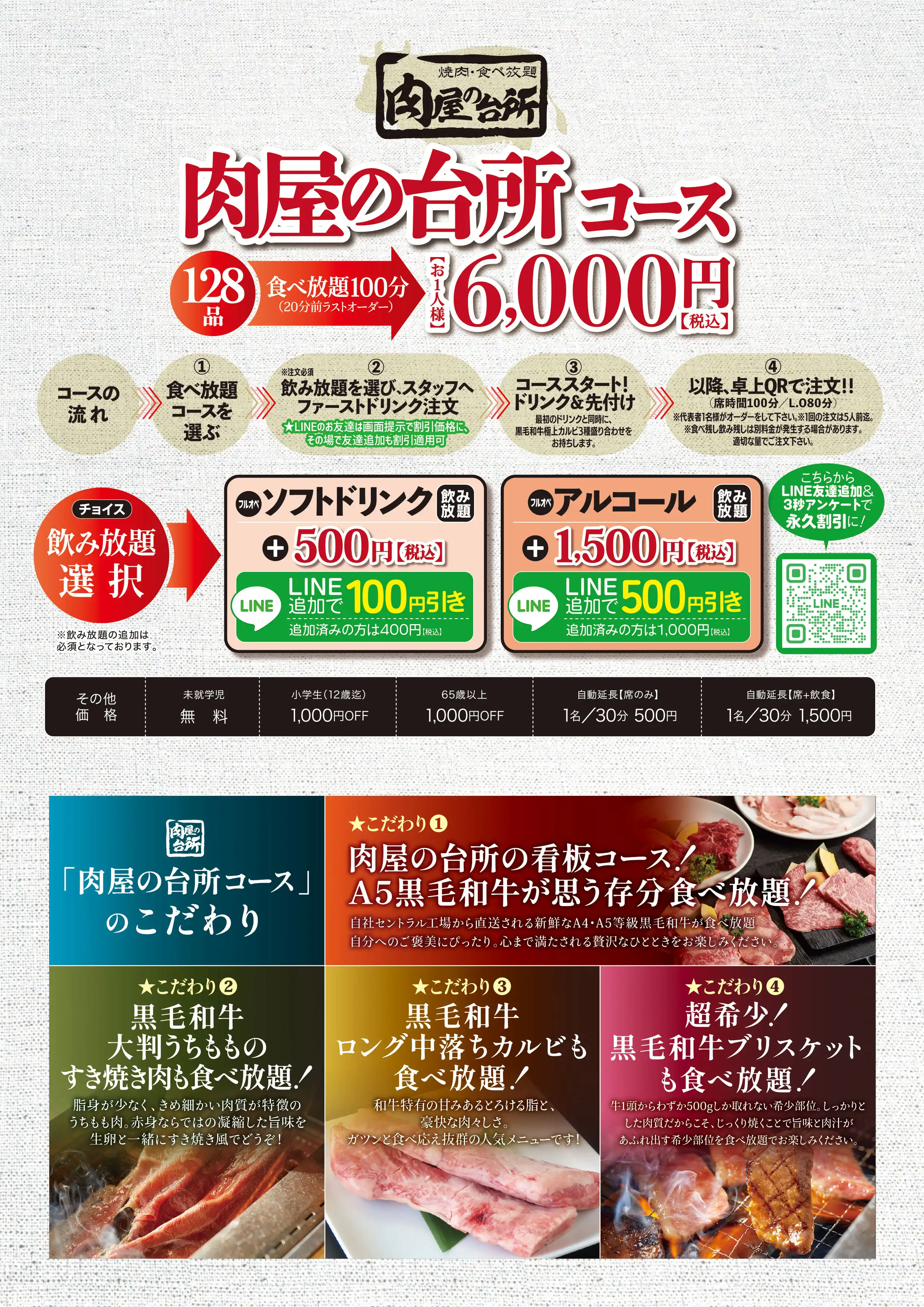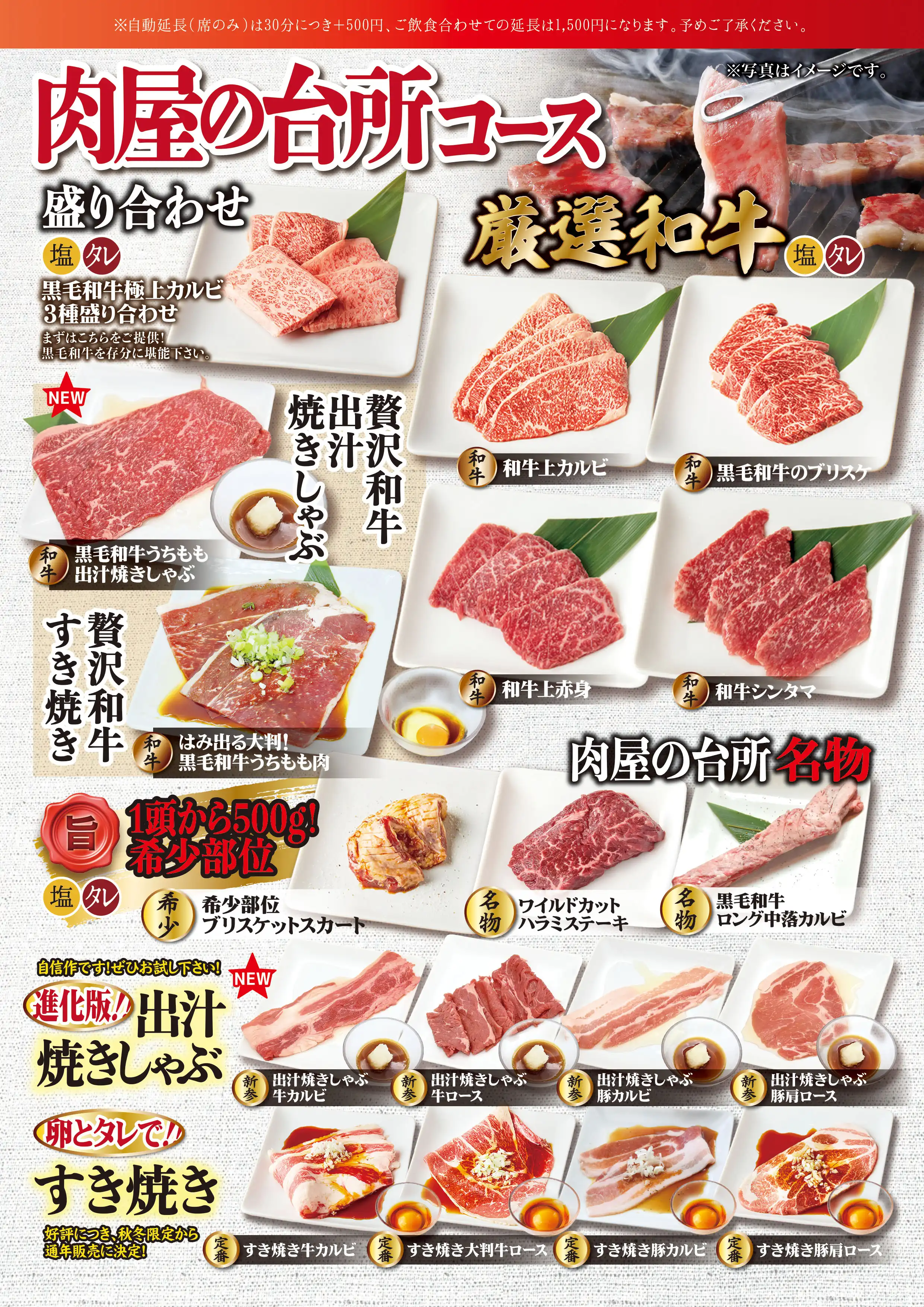 | コース内容 | 肉屋の台所 焼肉コース 肉屋の台所コース 肉屋の台所 特選コース |
