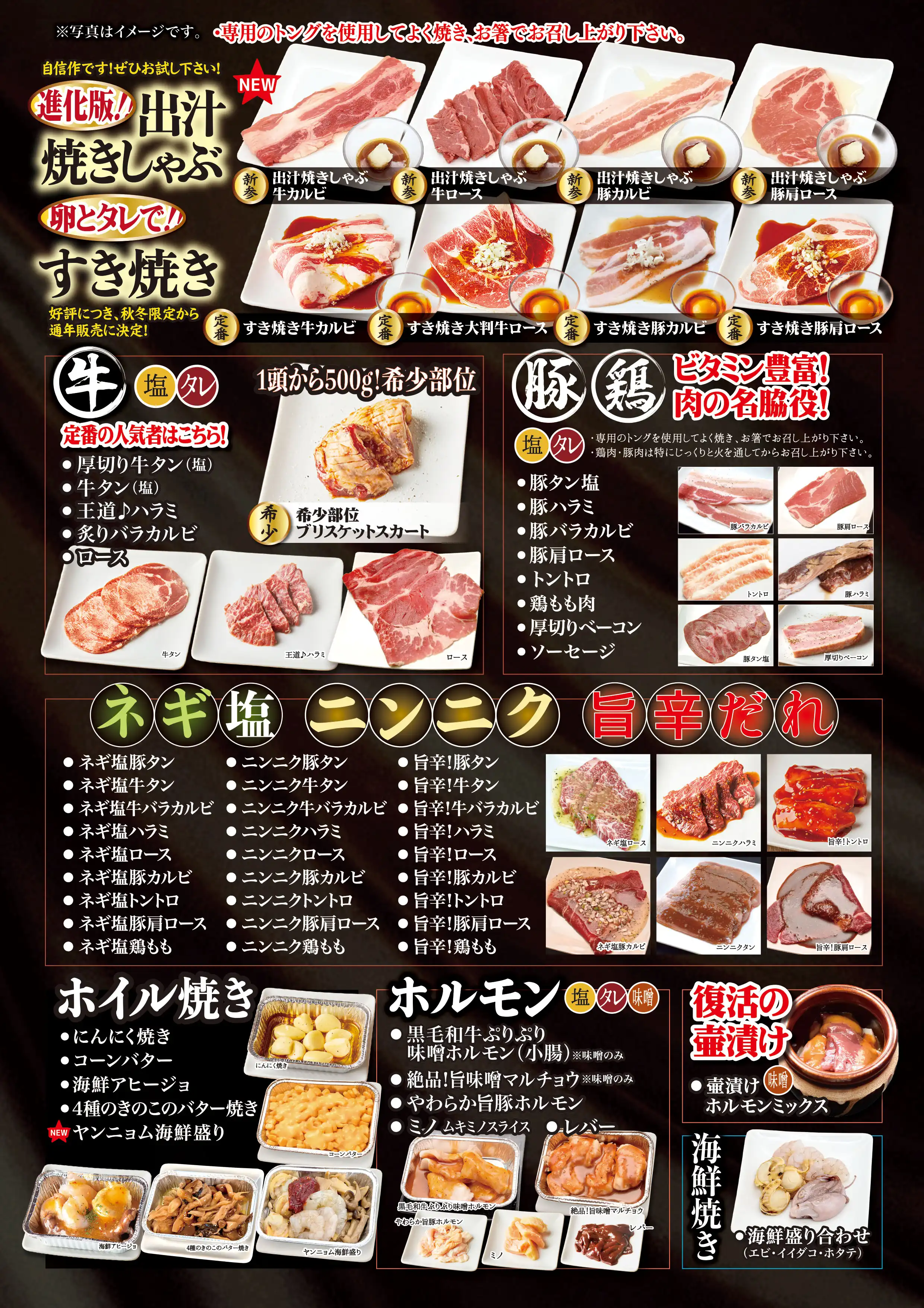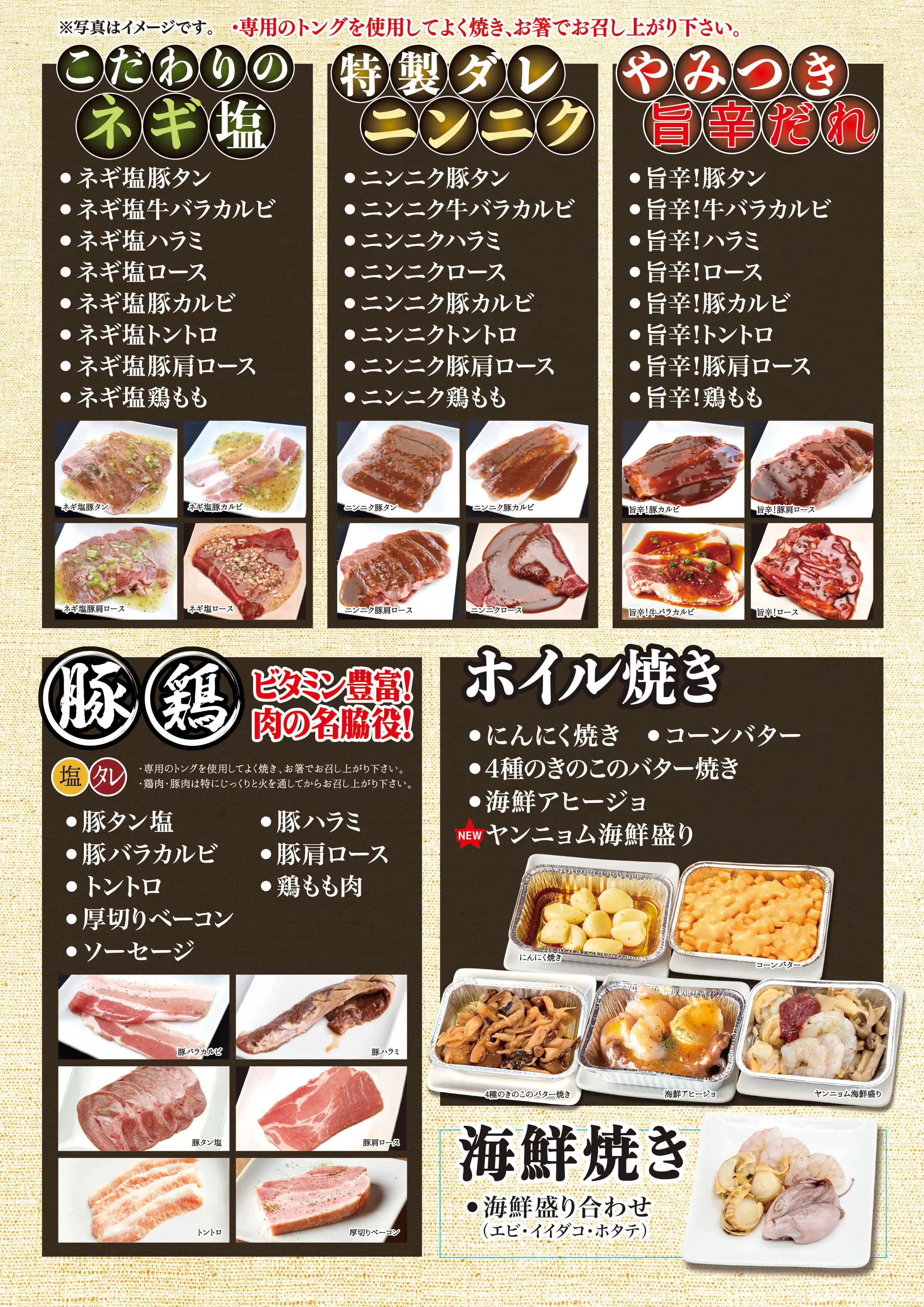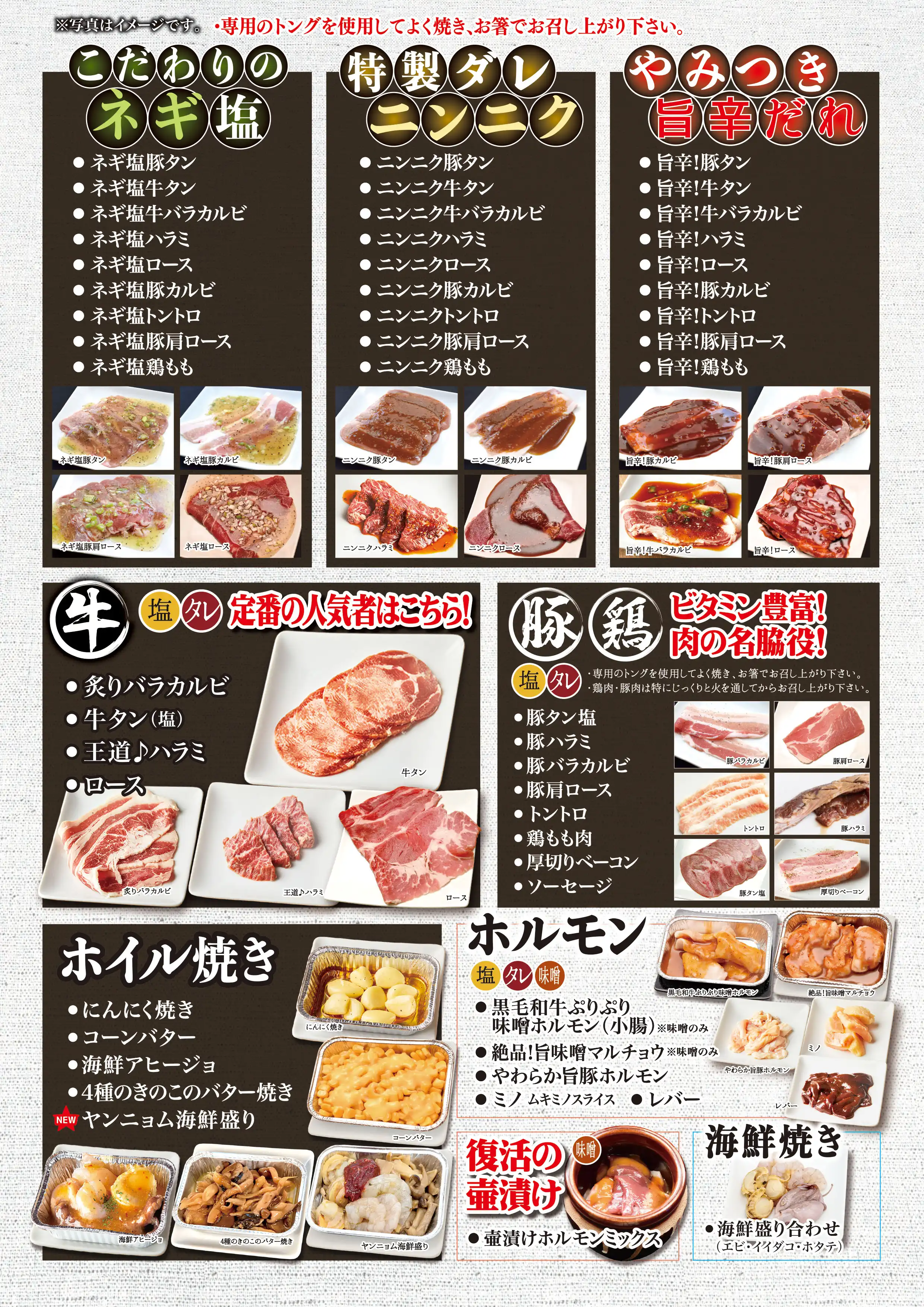 | コース内容 | 【肉屋の台所 名物】(塩・タレ) 肉屋名物ワイルドカットハラミステーキ 【1頭から500g!希少部位】(塩・タレ) 希少部位ブリスケットスカート 【出汁焼きしゃぶ】 出汁焼きしゃぶ牛カルビ/出汁焼きしゃぶ牛ロース/出汁焼きしゃぶ豚カルビ/出汁焼きしゃぶ豚肩ロース 【すき焼き】 すき焼き牛カルビ/すき焼き大判牛ロース/すき焼き豚カルビ/すき焼き豚肩ロース 【牛・豚・鶏】(塩・タレ) 王道ハラミ/炙りバラカルビ/ロース/豚タン/豚ハラミ/豚バラカルビ/豚肩ロース/トントロ/鶏もも/厚切りベーコン/ソーセージ 【復活の壷漬け】 壷漬けホルモンミックス 【ホルモン】(塩・タレ・味噌) やわらか旨豚ホルモン/ミノ/黒毛和牛ぷりぷり味噌ホルモン(小腸)/絶品!旨味噌マルチョウ/レバー 【ネギ塩】 ハラミ/タン/牛バラカルビ/ロース/豚カルビ/トントロ/豚肩ロース/鶏もも 【ニンニクだれ】 ハラミ/タン/牛バラカルビ/ロース/豚カルビ/トントロ/豚肩ロース/鶏もも 【旨辛だれ】 ハラミ/タン/牛バラカルビ/ロース/豚カルビ/トントロ/豚肩ロース/鶏もも 【サイドメニュー】 手仕込み白菜生キムチ/カクテキ/キムチ盛り合わせ/オイキムチ/もやしナムル/小松菜ナムル/シーザーサラダ/肉屋のサラダ(特製塩ごまだれ)/まき野菜/塩だれキャベツ/おつまみメンマ/ポテトサラダ/ごはん/肉屋のカレー/一口冷麺一/口冷麺(梅味)/コムタンスープ/韓国のり/おつまみうずら/チヂミ/ビビンバ 【肉屋のTKGシリーズ】 肉屋のTKG しょうゆ・塩/肉屋のTKGネギ油 【焼き野菜・ホイル焼き】 焼き野菜盛り/にんにく焼き/4種のきのこのバター焼き/コーンバター/海鮮アヒージョ/ヤンニョム海鮮盛り 【海鮮】 海鮮盛り合せ(エビ・イイダコ・ホタテ) 【デザート】 杏仁豆腐/フルーツポンチ 生チョコアイス・チョコ 生チョコアイス・バニラ 生チョコアイス・抹茶 ※入荷状況により、アイスの種類が変更となる場合がございます。 |