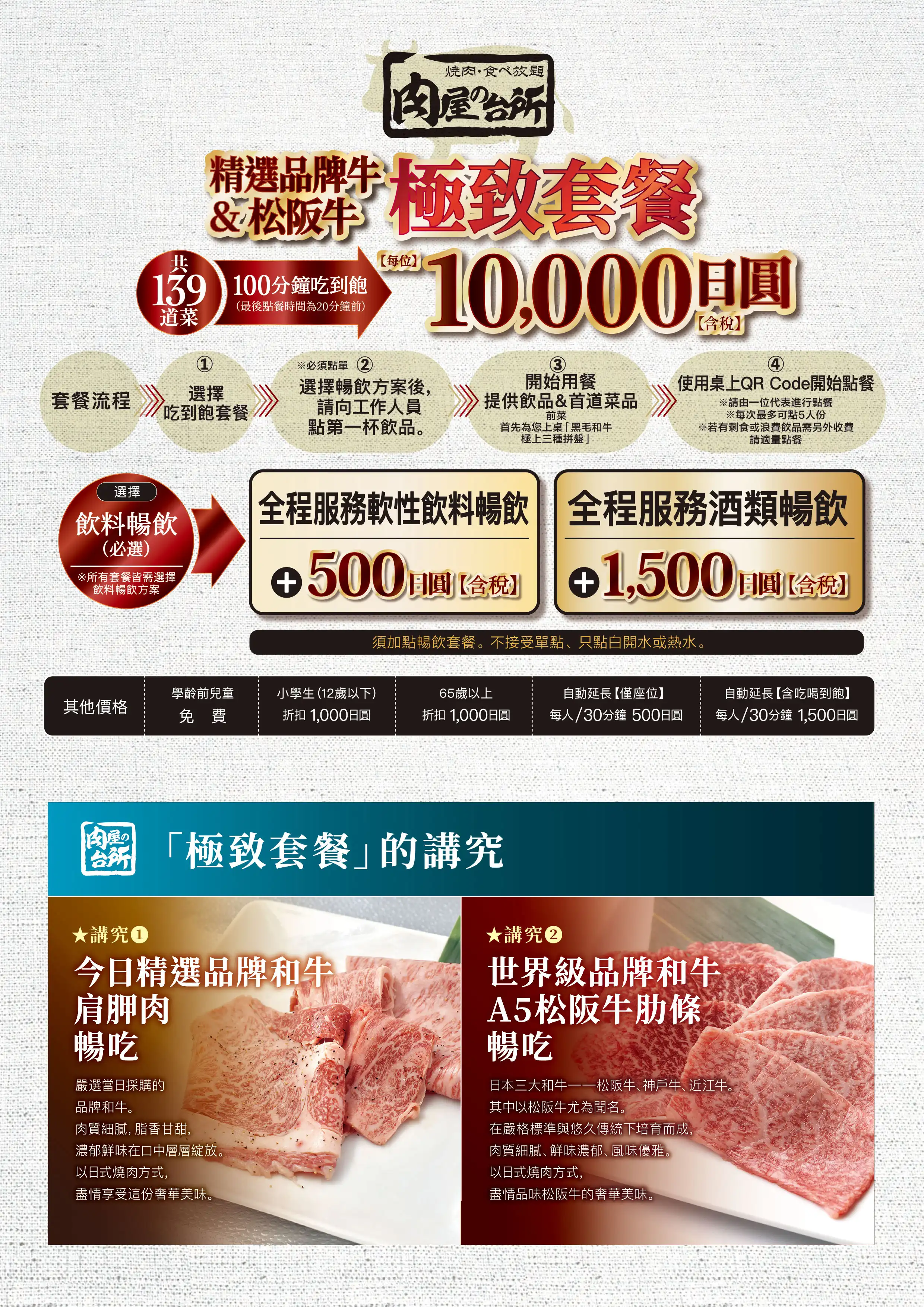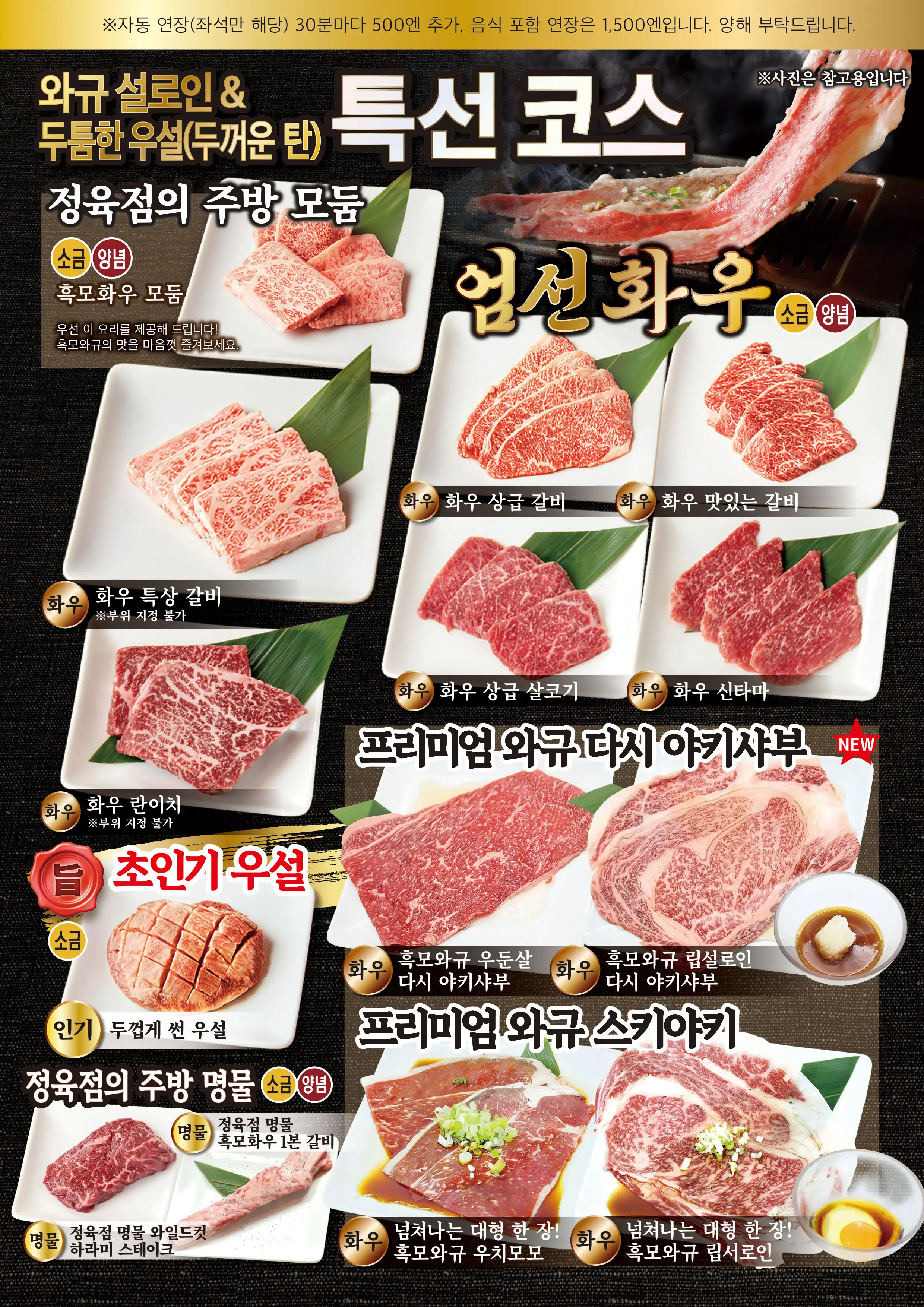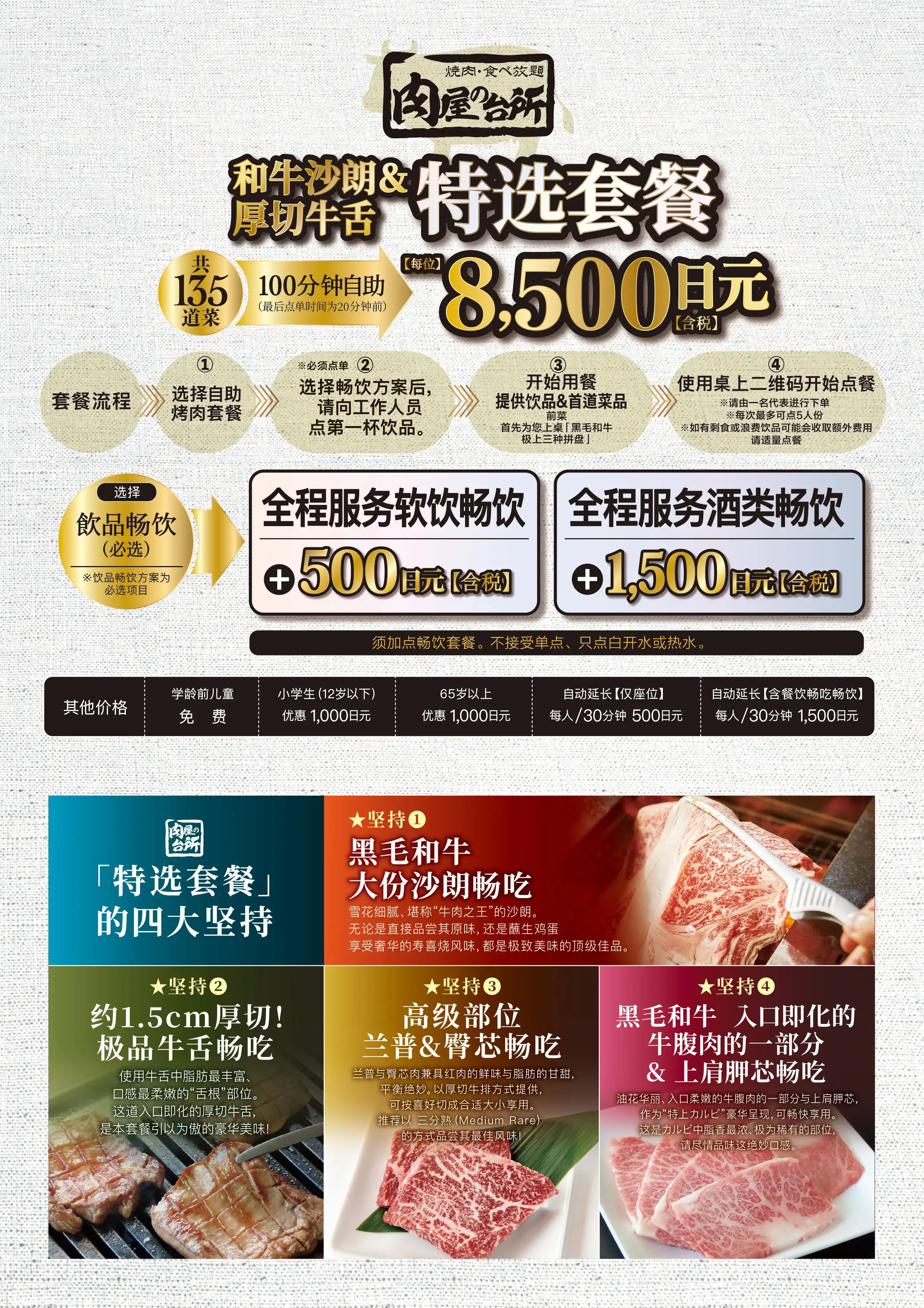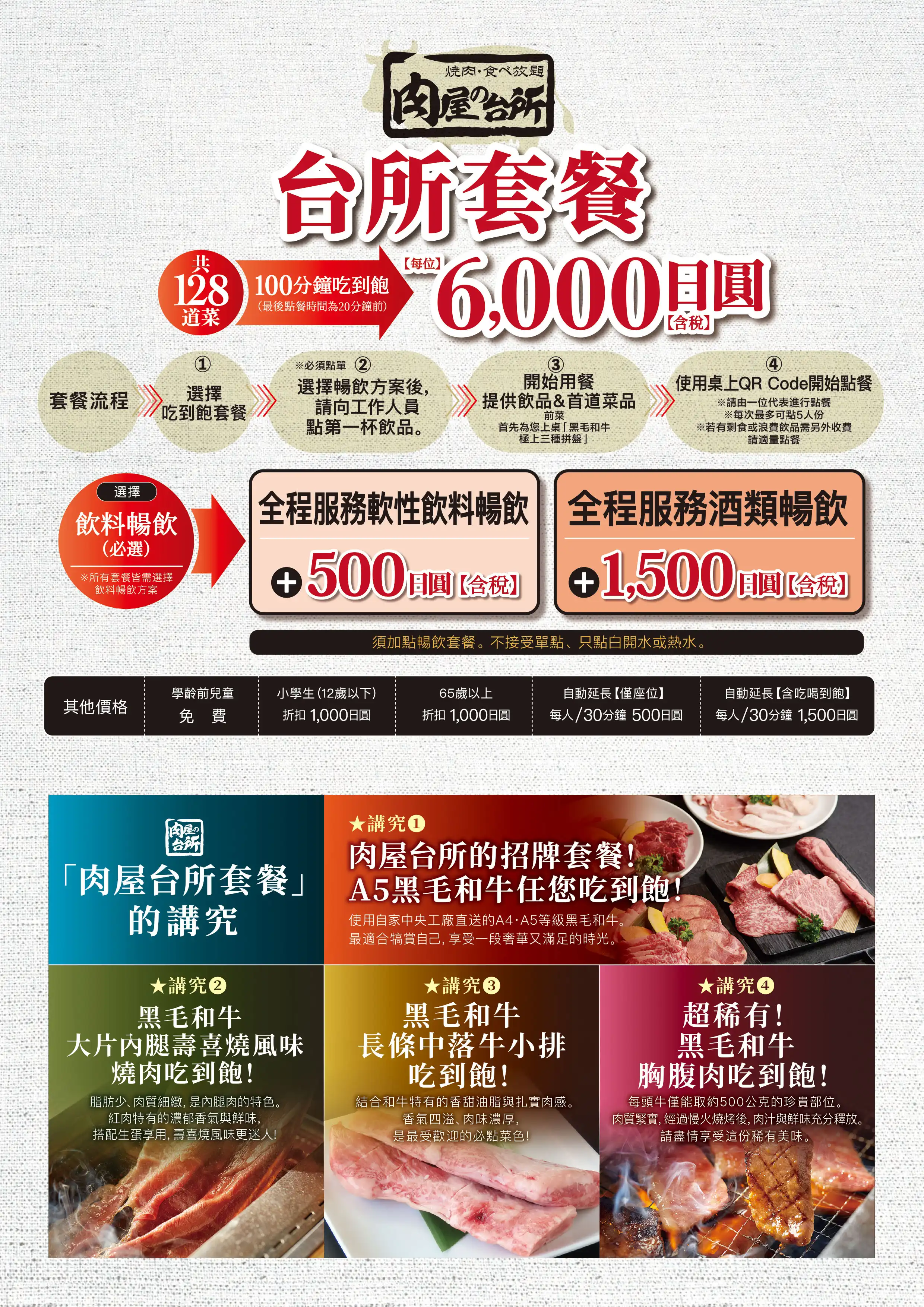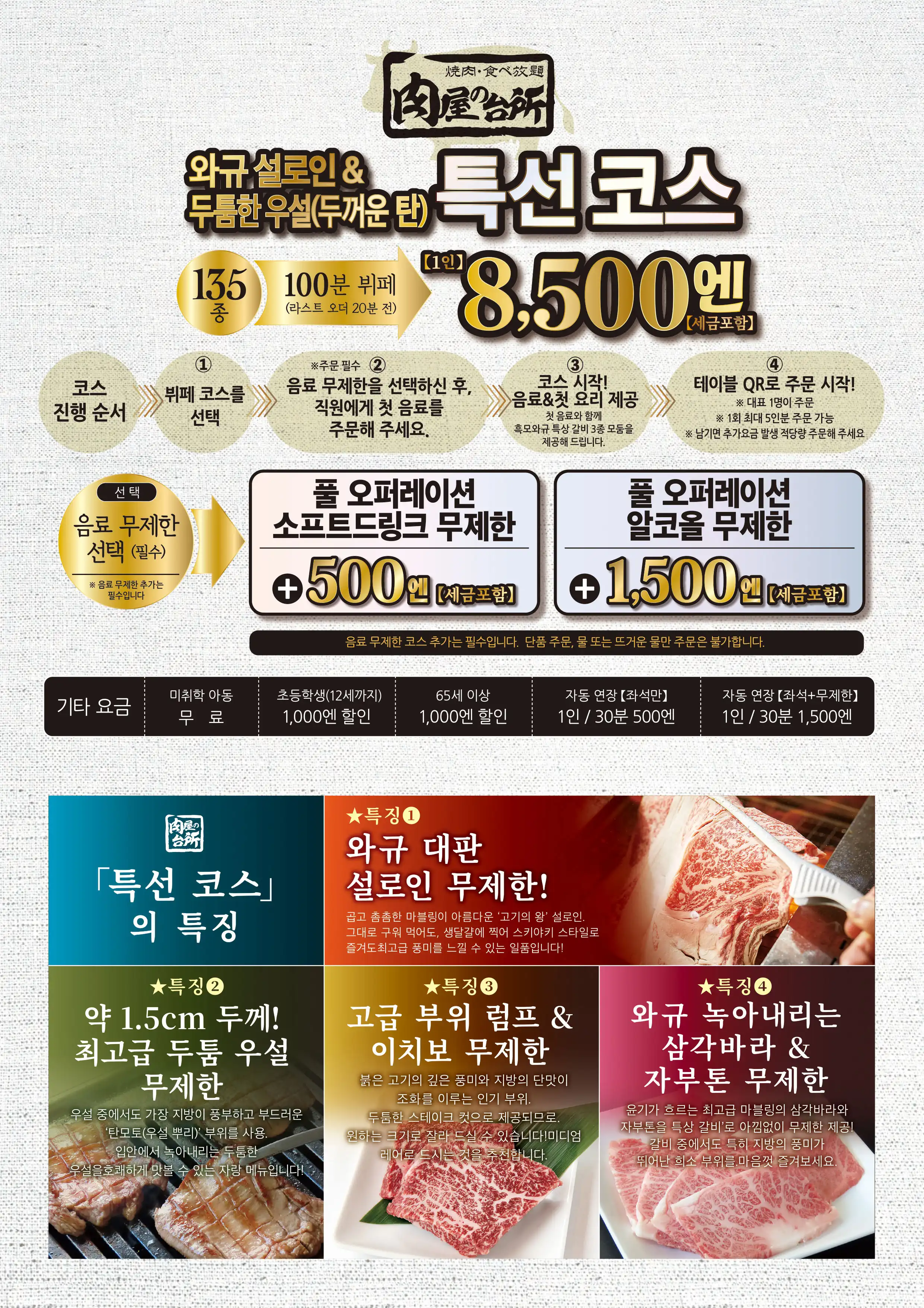 当店で和牛リブサーロインが食べ放題になるのは8,250円のコースだけなのですが、 こちらの大皿コースでは、そのリブサーロインを含めた厳選部位を食べ放題ではなく“ちょうどいい量”で楽しめる内容になっています。料金にはソフトドリンク飲み放題が含まれております。※写真は2人前の量となっております。★ご予約の際はお電話にて店舗までお問い合わせください。